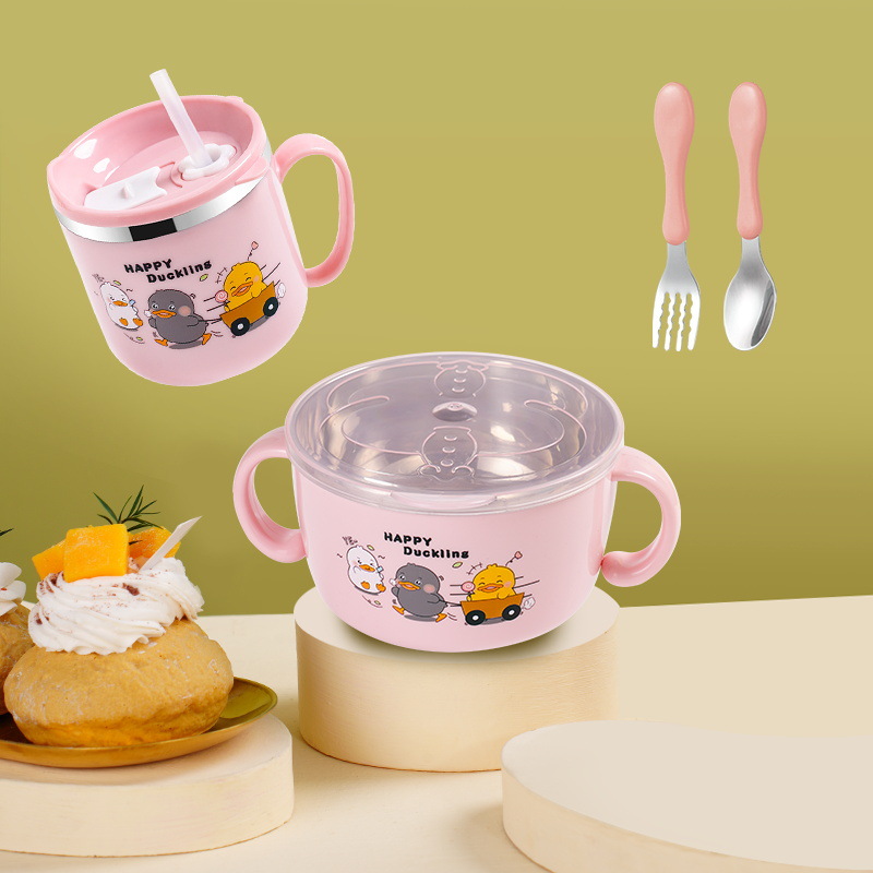 304子供ボウルセットステンレススプーンフォークカップ赤ちゃんお食事赤ちゃん二重补助ボウル保温食器ギフト