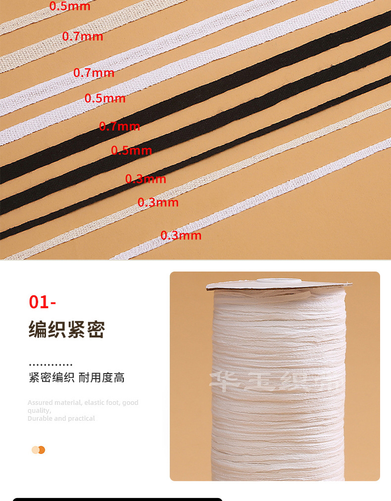 規格型番 0.3cm本白 (1巻あたり400ヤード),0.3cm漂白 (1巻あたり400ヤード),0.3cm黒 (1巻あたり400ヤード),0.5cm本白(280メートル1巻),0.5cm漂白 (1巻あたり220メートル),0.5cmブラック (1巻あたり220メートル),0.7cm本白 (1巻あたり280メートル),0.7cm漂白 (1巻あたり220メートル),0.7cm黒 (1巻あたり220メートル)