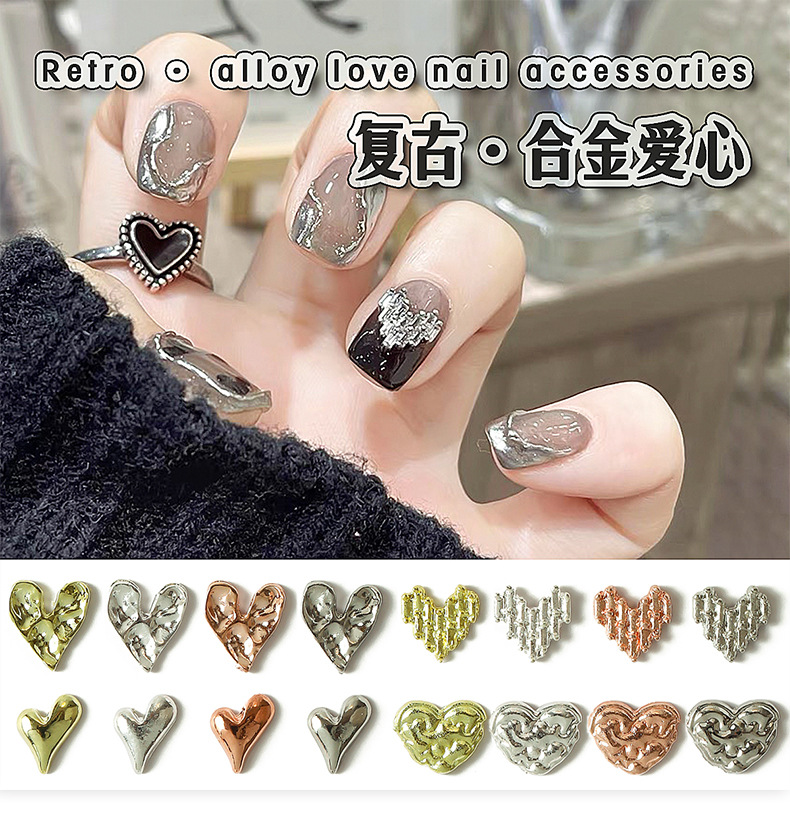ネット赤新合金愛ネイルアクセサリー金銀色金属歪心桃心液体愛爪装飾