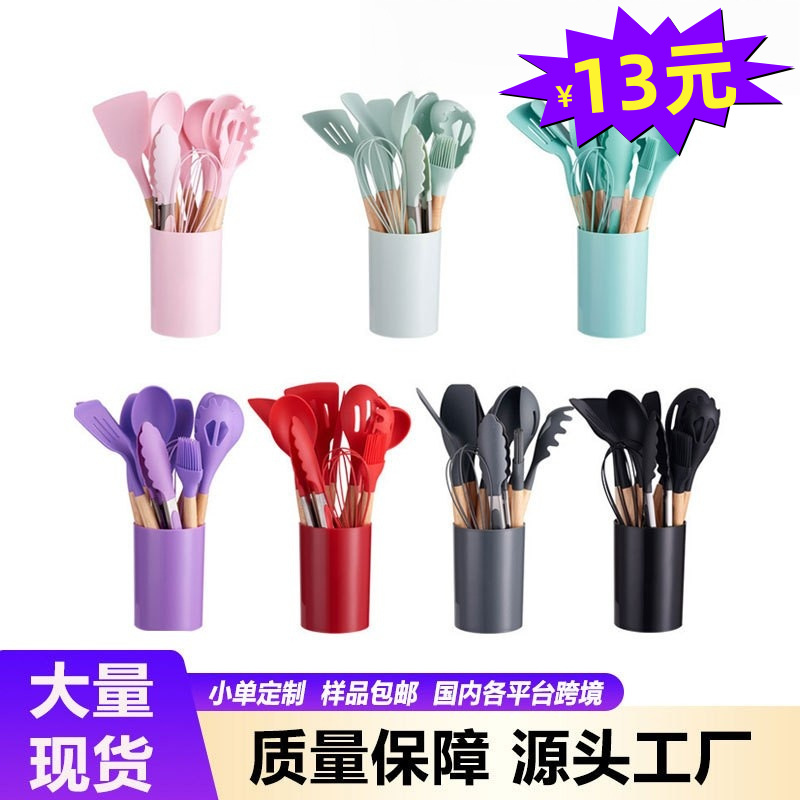 木の柄のシリカゲルの調理器具セット12点セットの収納桶がくっつかないシャベルスプーンの調理器具11点セットのシリカゲルシャベルスプーン