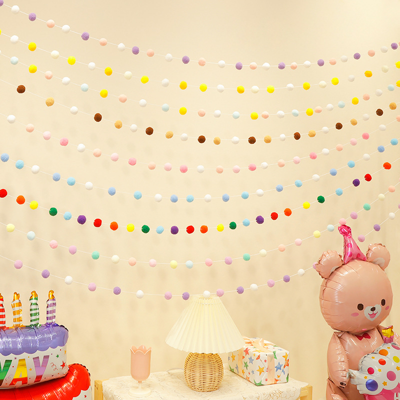 彩色毛毛球串旗毛毡三角旗儿童生日派对装饰教室房间露营帐篷挂件