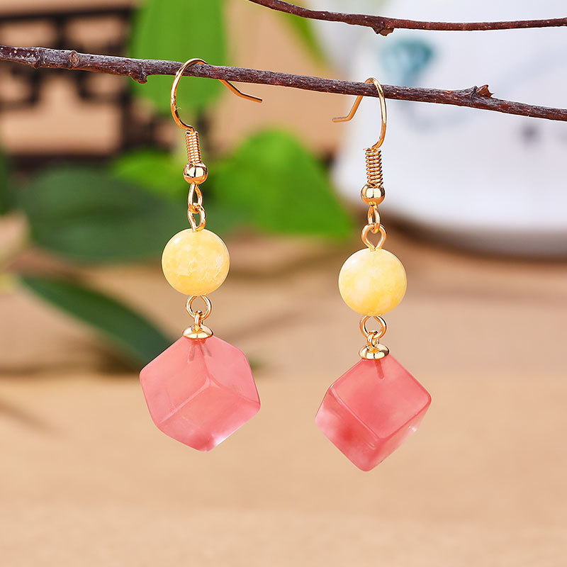 中国風赤紋石方糖イヤリングメッキ24k金モザイク耳線耳フック耳釘女性モデル