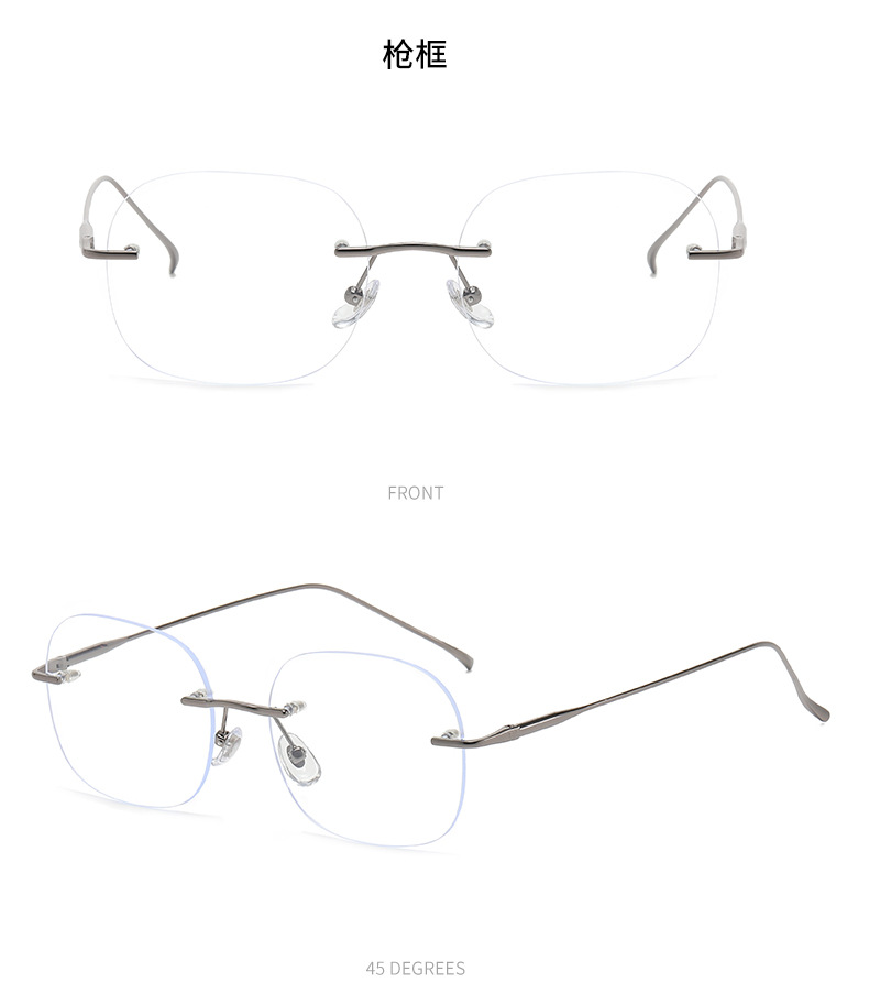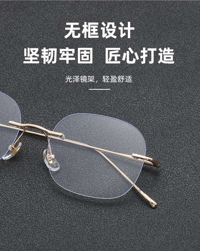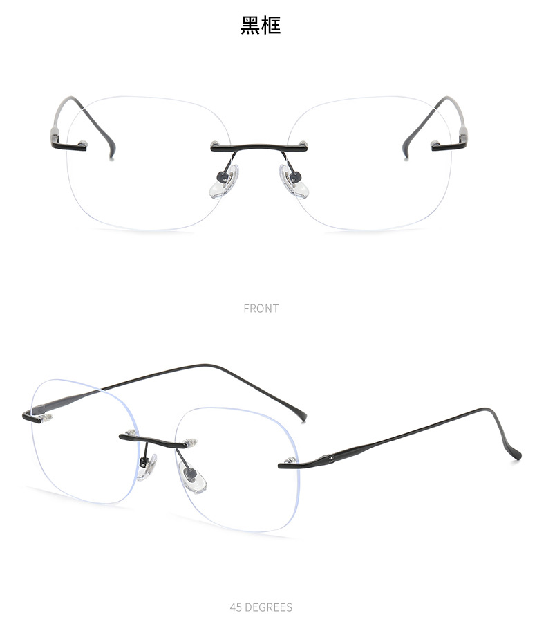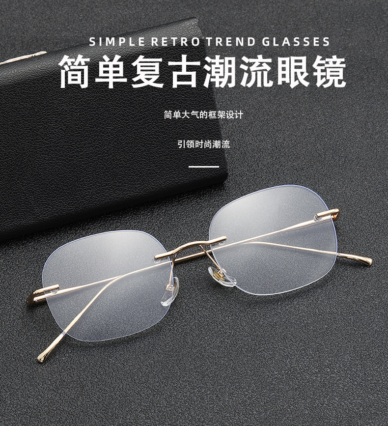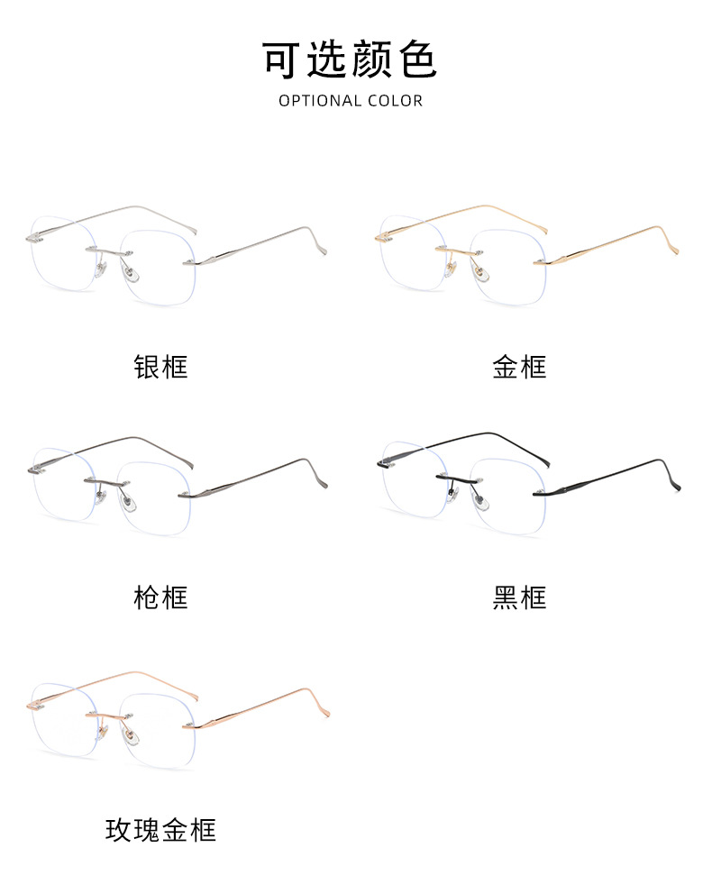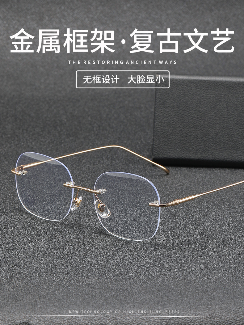 女性用超軽量純チタンリムレスメガネ、ハイエンド近視、アメリカンカットエッジ、色が変わる大きな顔のメガネフレームを装備可能
