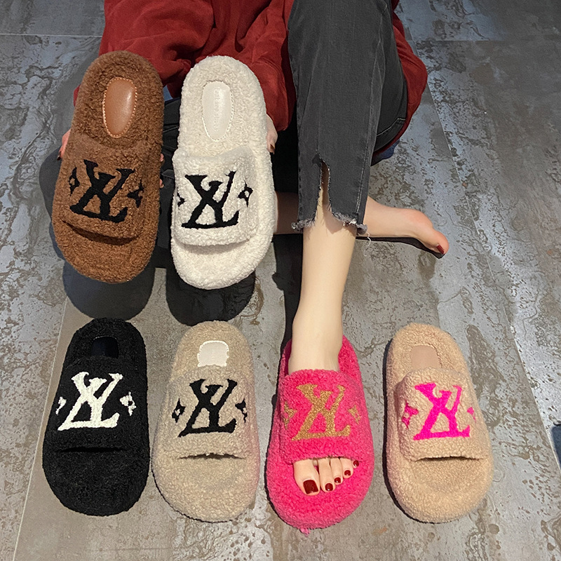 ラムウールスリッパ女性のアウターウェア 2024 新しい秋と冬のファッションクロスフラットサンダルホームコットンスリッパ卸売