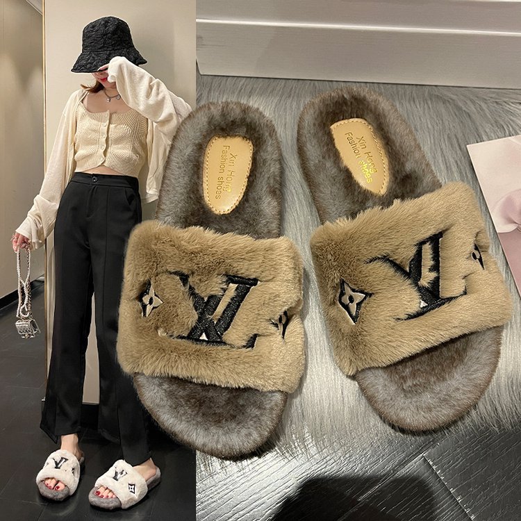 网红厚底刺绣毛毛拖鞋女款外穿2025秋冬新款时尚舒适字母棉拖鞋女