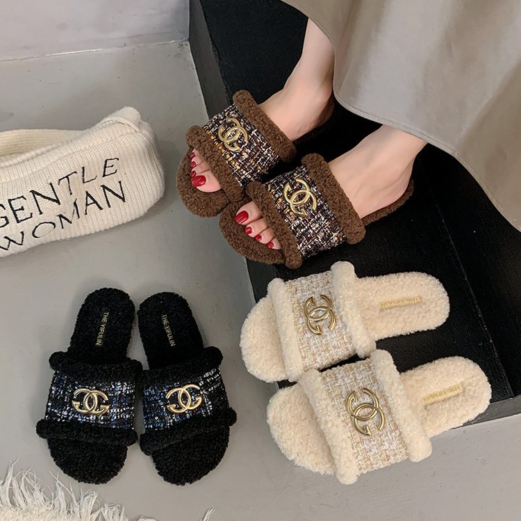2025秋冬新作 8CM厚底レタープリントファー付きスリッパ 外履き シャネル風ラムウールスリッパ レディース