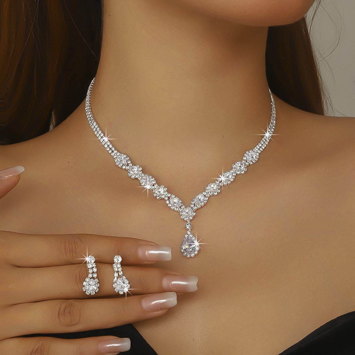 时尚首饰套装女士水钻锆石璀璨项链耳环水滴形轻奢优雅饰品