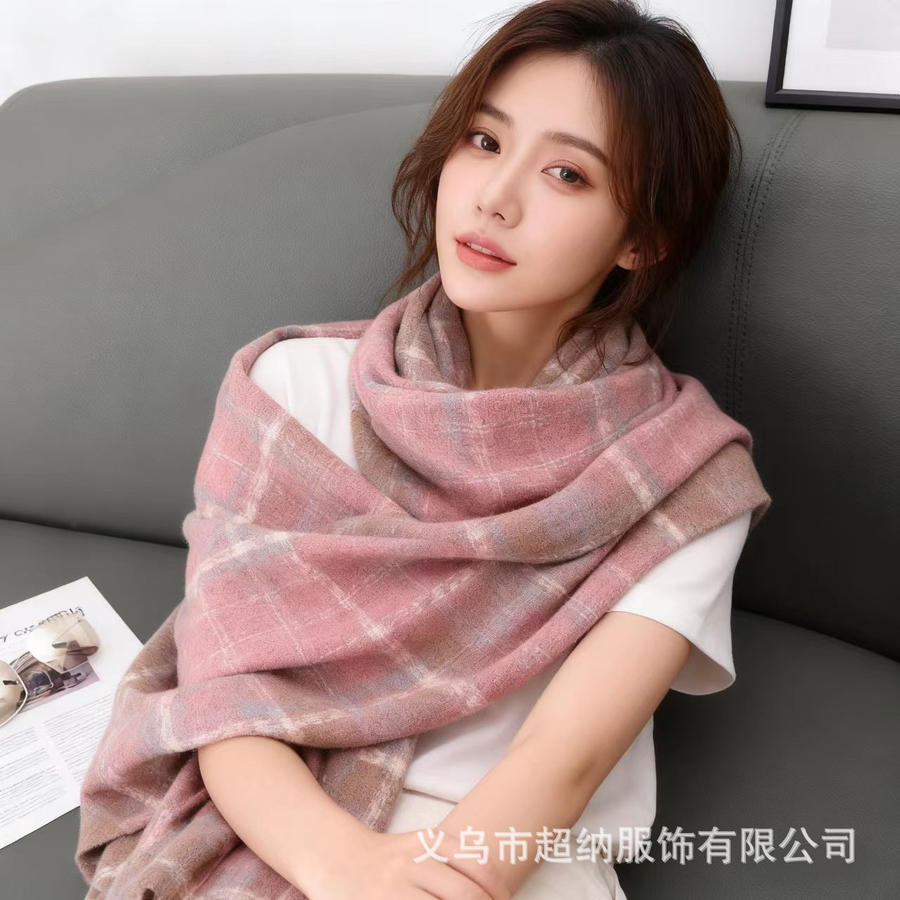 冬季新款格子围巾女软糯仿羊绒流苏围脖复古加厚保暖百搭披肩批发
