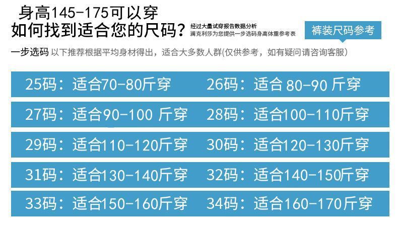 サイズ 26は80-90斤を提案します。,27推奨90-100斤,28推奨100-110斤,29推奨110-120斤,30推奨120-130斤,31提案130-140斤,32推奨140-150斤,33提案150-160斤,34提案160-170斤,36提案170-185斤,38提案185-200斤