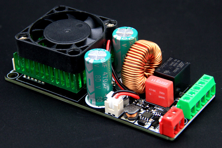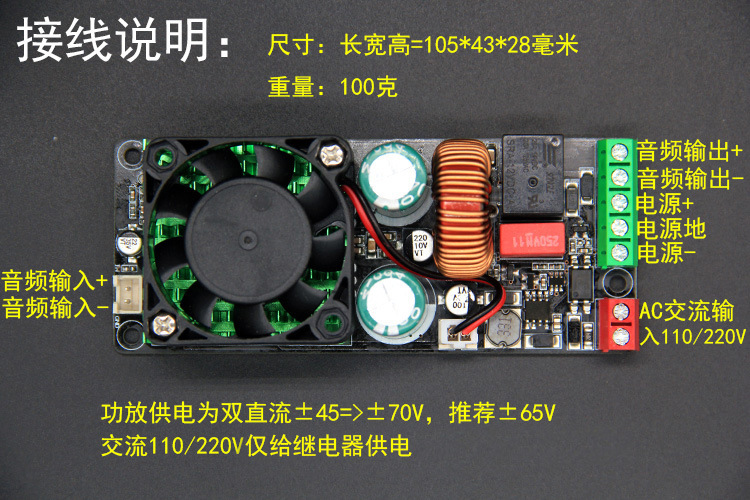 板要双直流供电(3条线那种,不懂的百度)单电源不行!不行!不行!供电电压±45V~± 70V,太低不工作,太高易烧板。板子最大有效功率500W(在±65V 4欧负载输入1V有效值的情况下)
