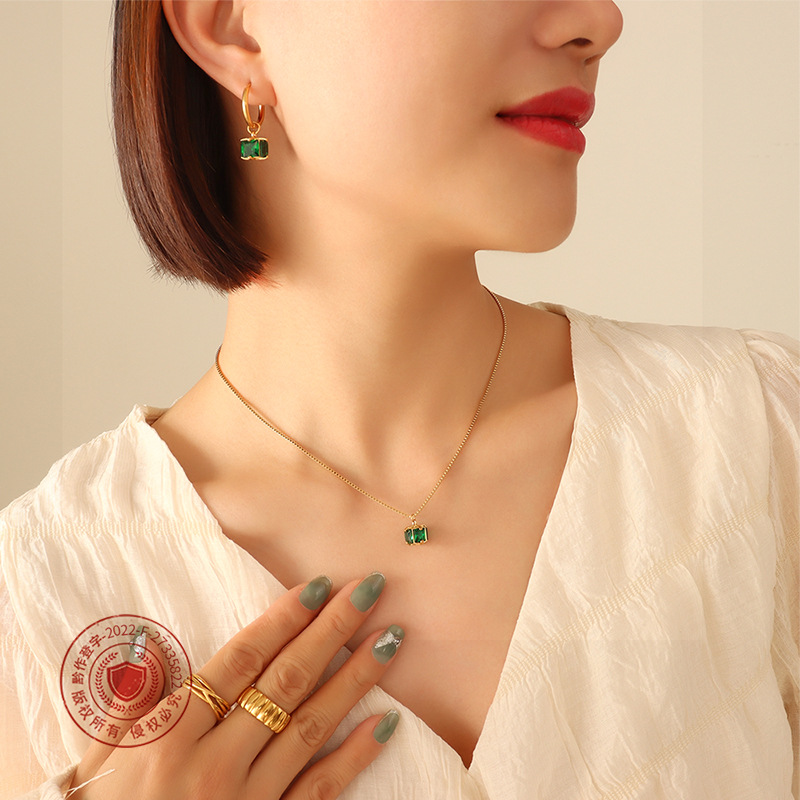 欧米の冷淡な風の大衆の設計は色を落とさないチタン鋼の四爪は先祖の母緑のジルコンのネックレスのイヤリングのアクセサリーのセットを掛けます。