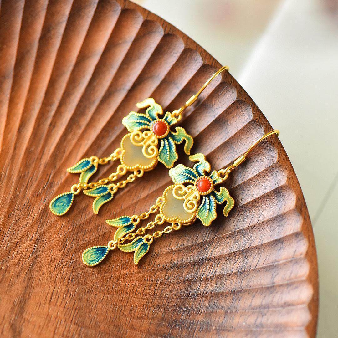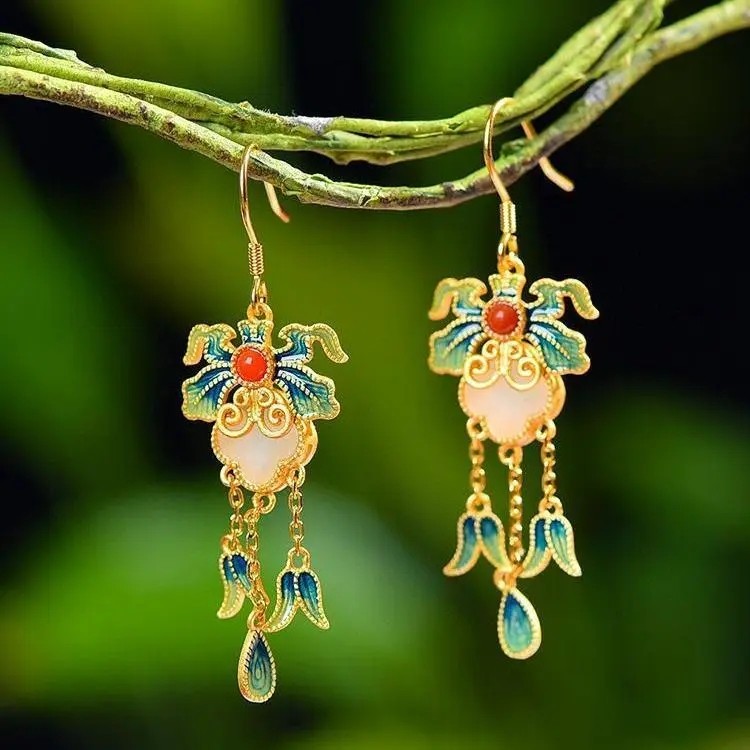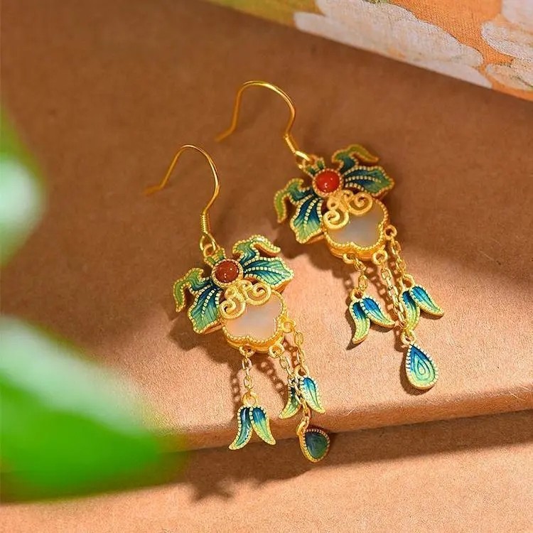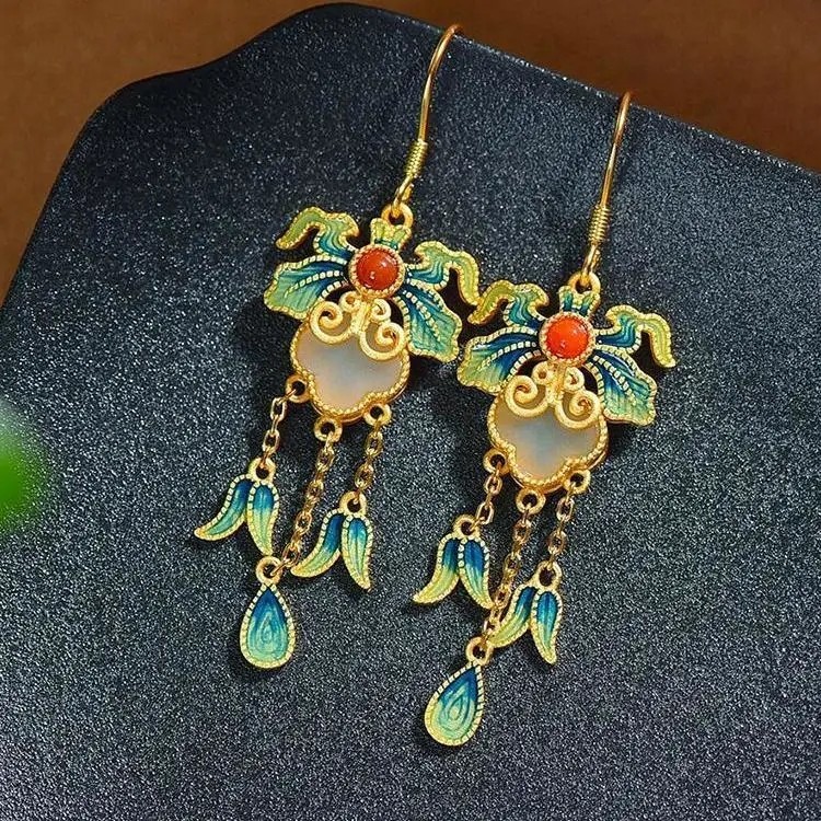 和田玉風イヤリング、古代風イヤリング、古法金彩エナメルイヤリング、中国風宮廷漢服民族風アクセサリー
