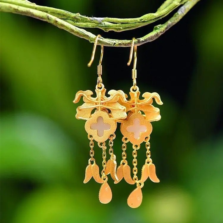宮廷風レトロS925シルバー天然和田白玉象嵌四季の花エナメルタッセルイヤリング超美品