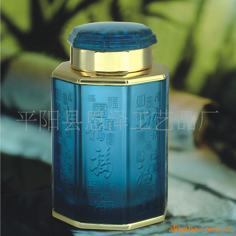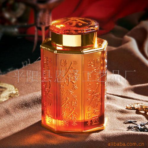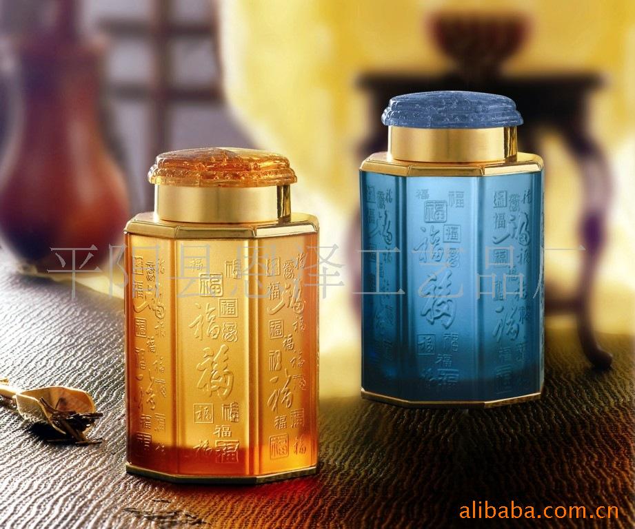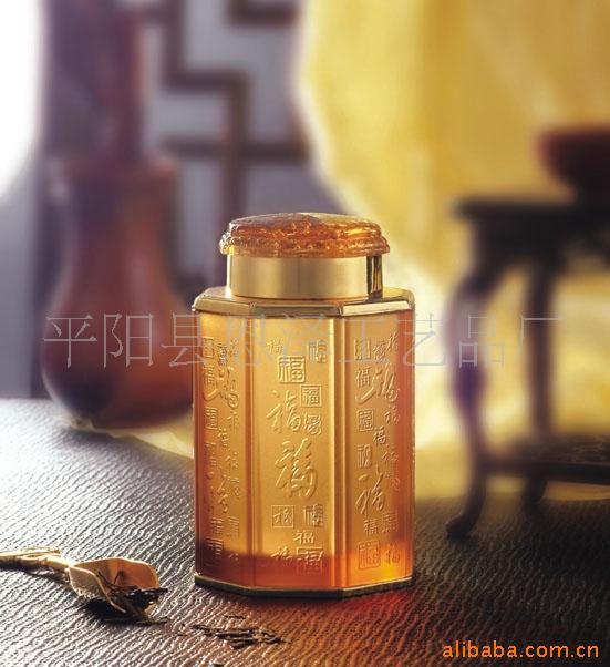 茶叶罐(笔筒)以中国传统名贵材质琉璃或玉石制作,风光部分以刻金属件镶嵌,精工细雕,栩栩如生。饰纹或雅菊惠兰,或花开富贵,镀24k金。整个产品既富有地方特色,有蕴涵传统文化,尊贵又不失高雅,是旅游纪念或馈赠亲有的理想产品