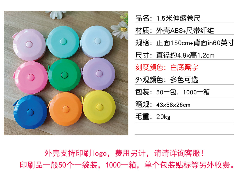 亲,本公司专业生产小卷尺,自产自销,1.5米,1.8米,2米小卷尺,支持定制logo(一个起印,另外收费),支持定制外壳颜色(上万可做,另外收费)支持定制皮尺刻度颜色(上万可做,另外收费)