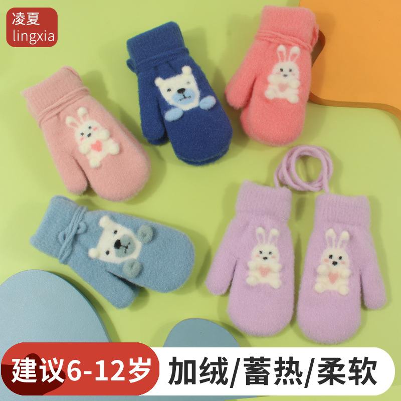 儿童手套冬季加绒加厚保暖男童女童毛绒可爱宝宝冬天防冻挂脖连指