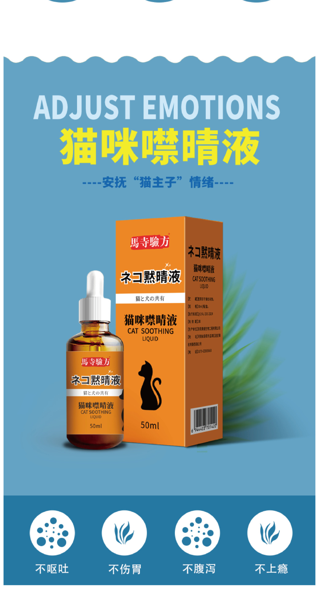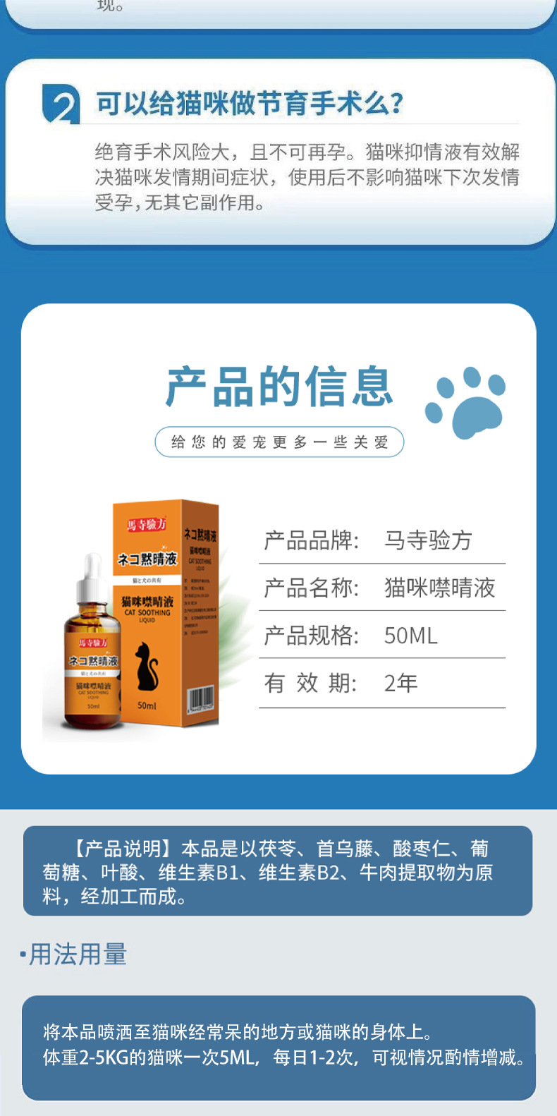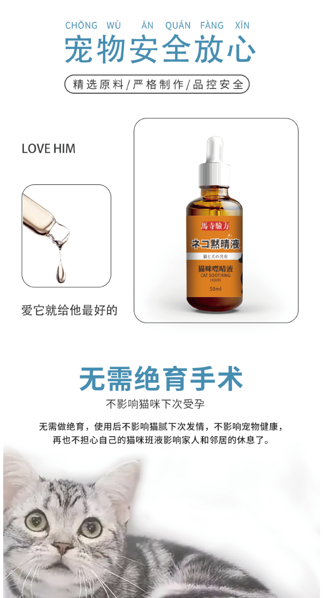 猫の鳴き止めスプレー50ml、オス猫・メス猫用、目を閉じる液体、鳴き声を防ぎ、尿を乱れさせない、ワンピース配送
