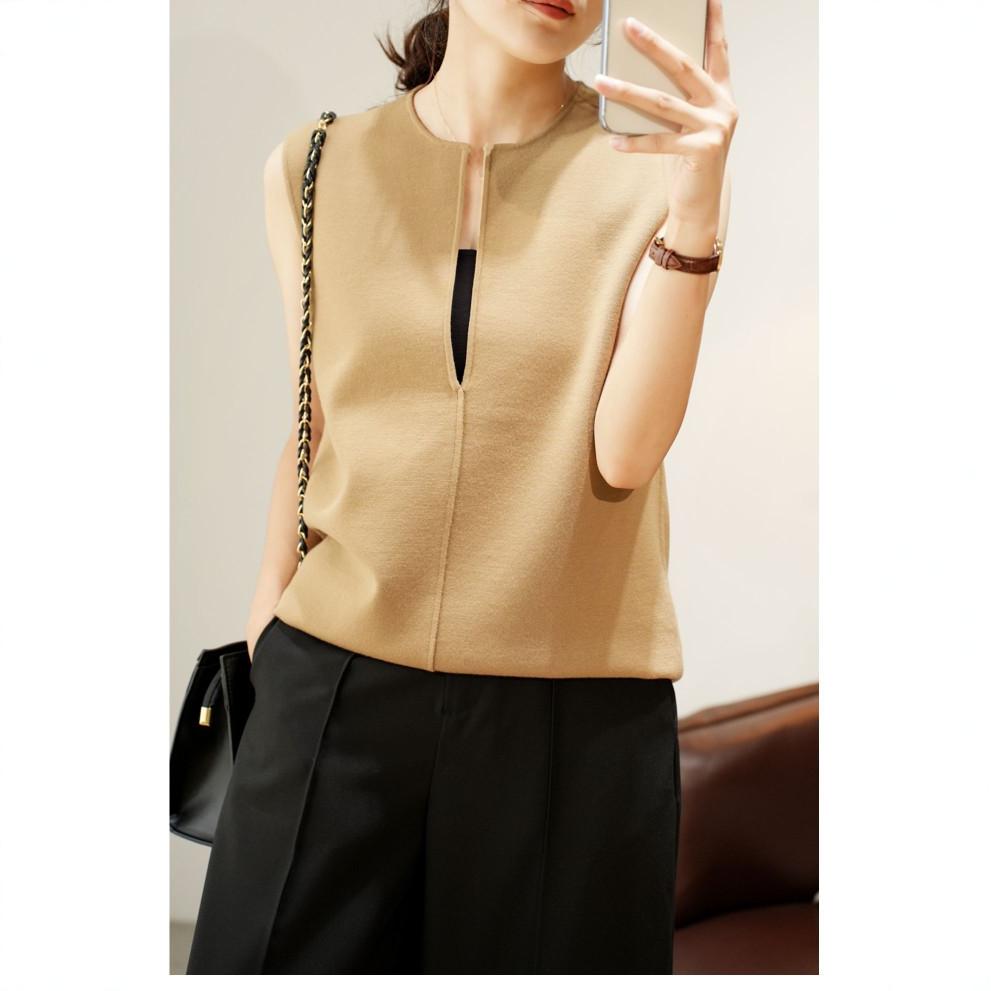 四平針工法によるレディースウール半袖ベスト、エレガントなVネック、重ね着スタイル、ノースリーブベスト、秋物婦人服