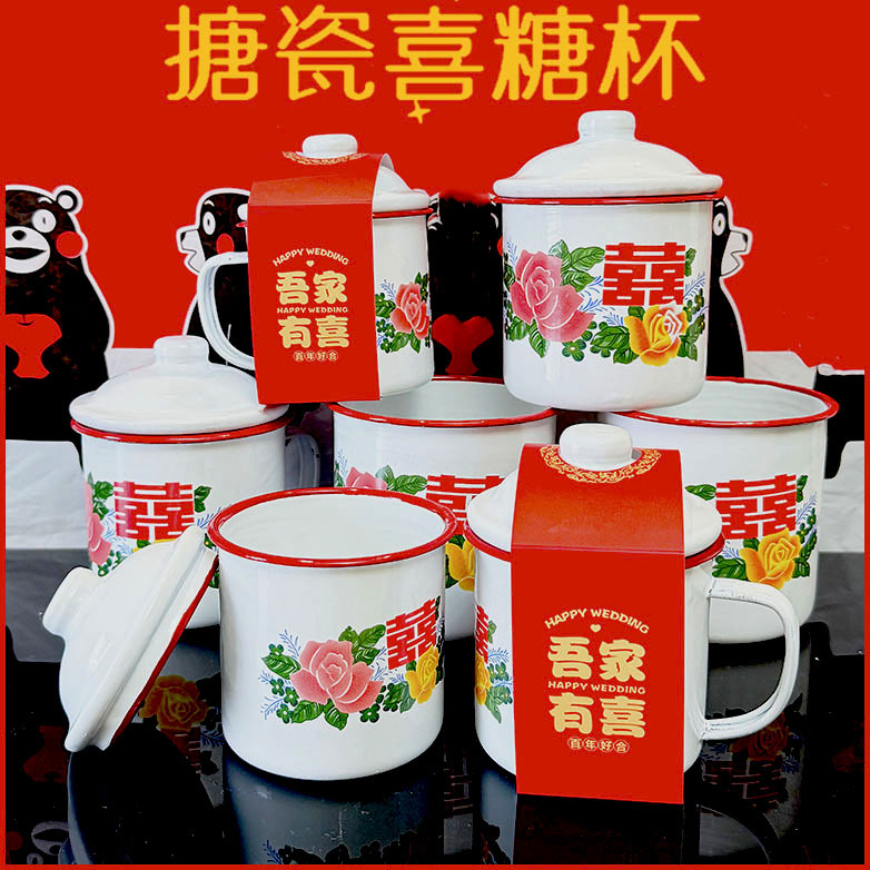 新款双喜款搪瓷杯红边喜糖杯复古搪瓷喜糖盒搪瓷茶缸喜礼双喜糖杯