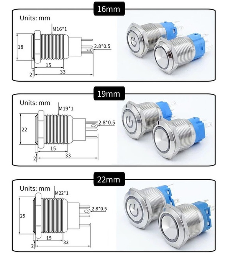 金属ボタンスイッチ8 12 16 19 22 25 30mmセルフロックリセットランプ付き起動電源キー