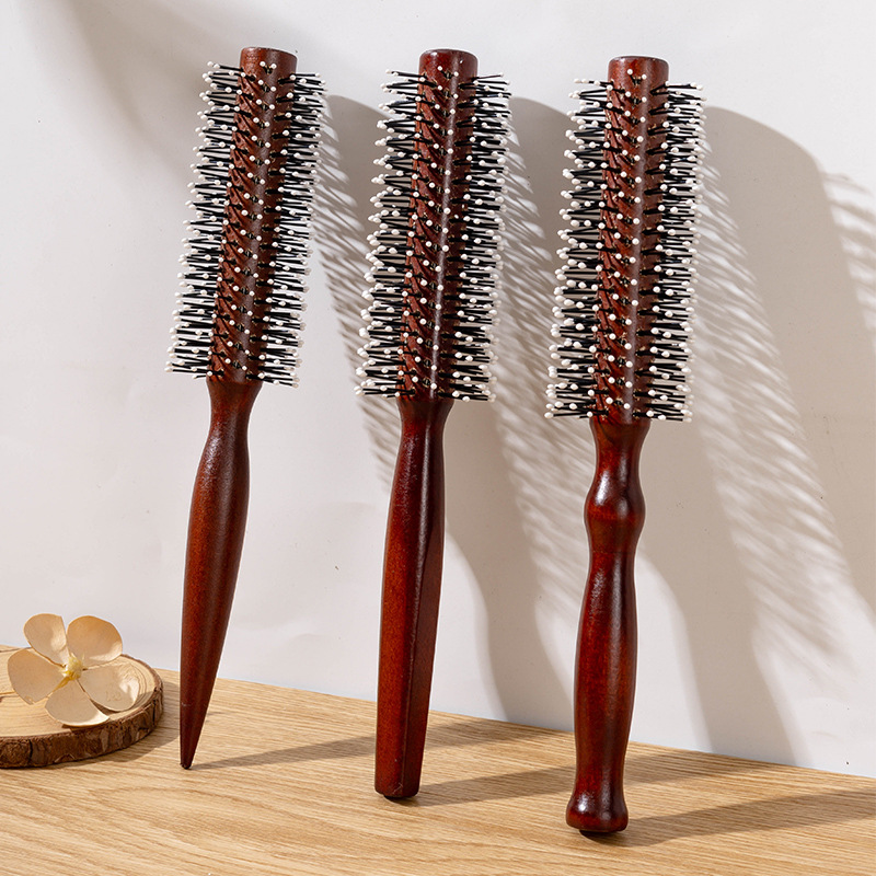 理髪店カーリングツール赤茶色の木製コームシリンダーカーリングコームふわふわヘアスタイルログローリングコーム