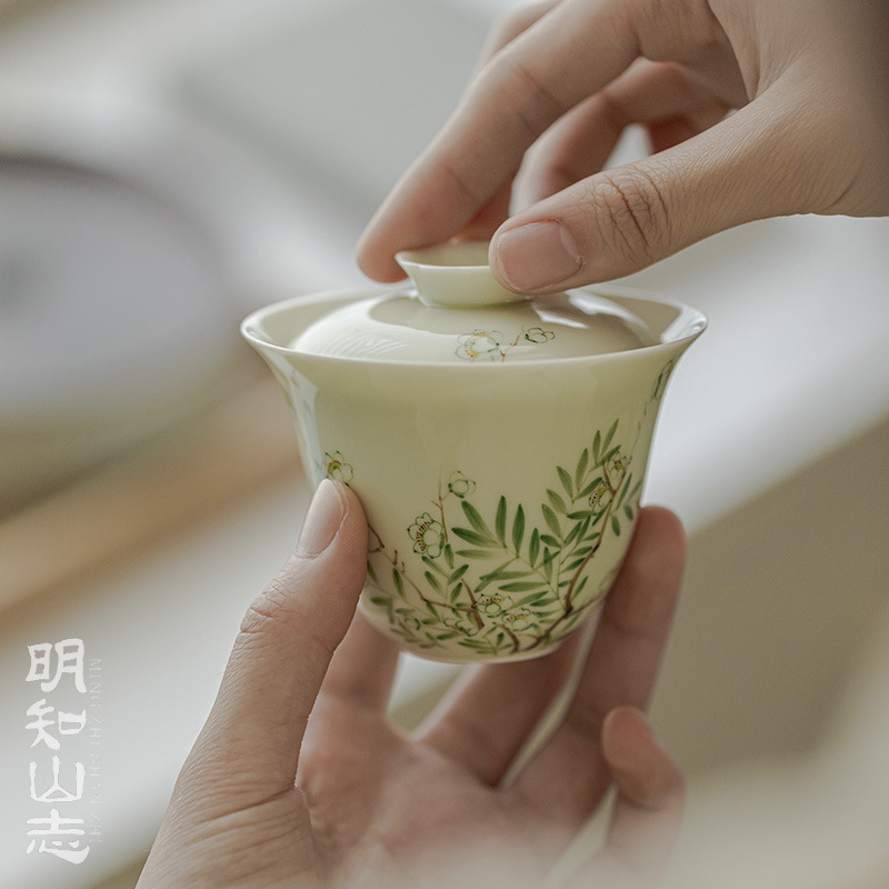 山志晴山藍月下西梅行思蓋碗の手描き梅の花の家庭用お茶を入れることを知っています。