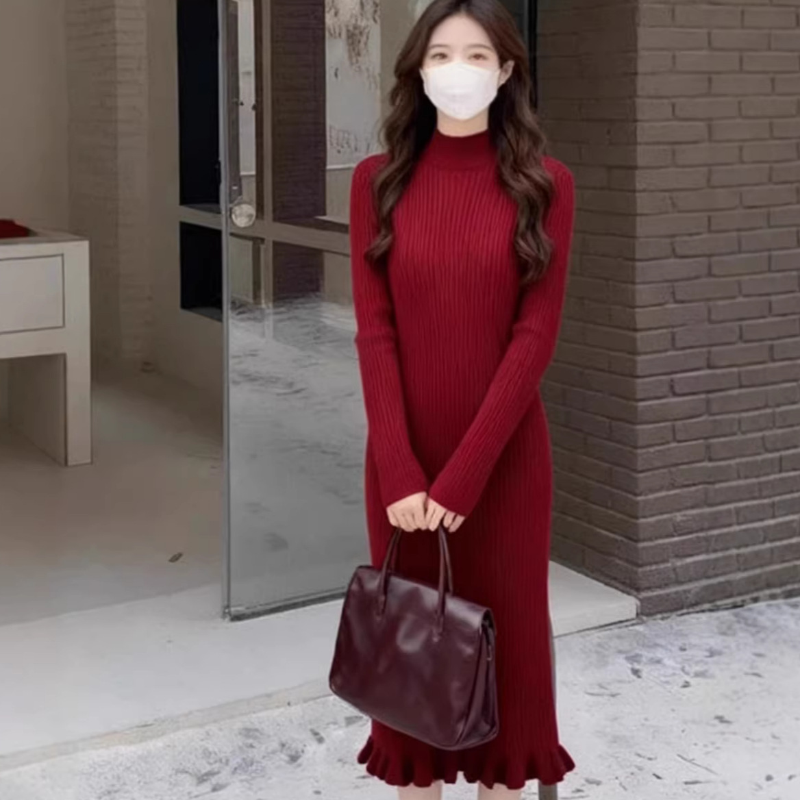 秋冬女款显瘦长袖针织连衣裙女半高领修身内搭打底毛衣长裙子