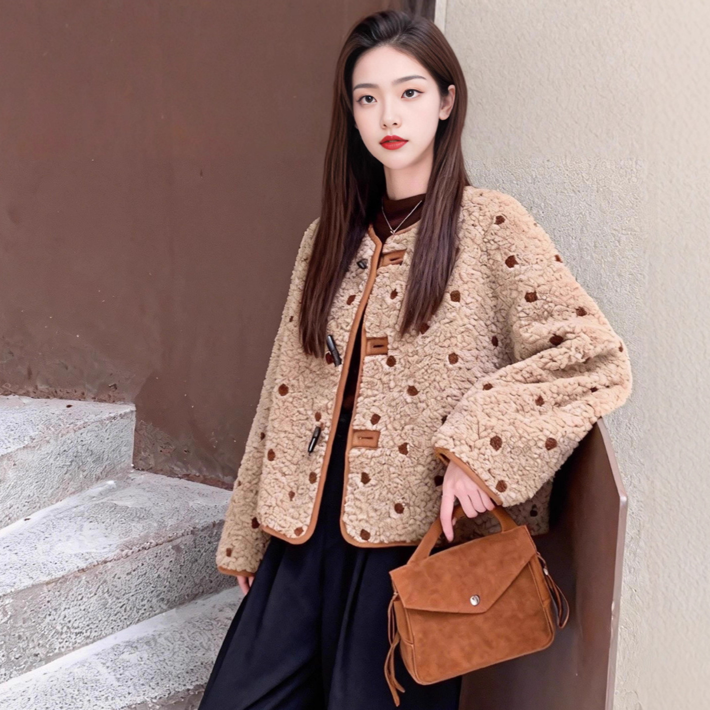 年轻时尚毛茸茸厚上衣短款仿皮草甜美波点皮毛一体双面穿毛毛外套