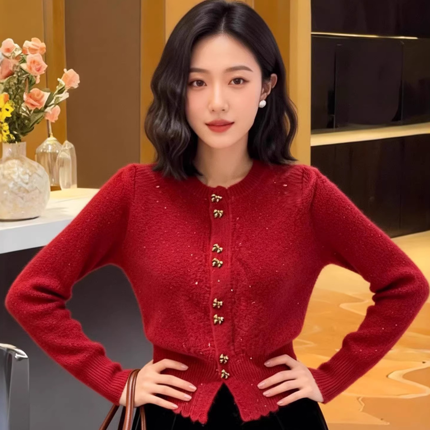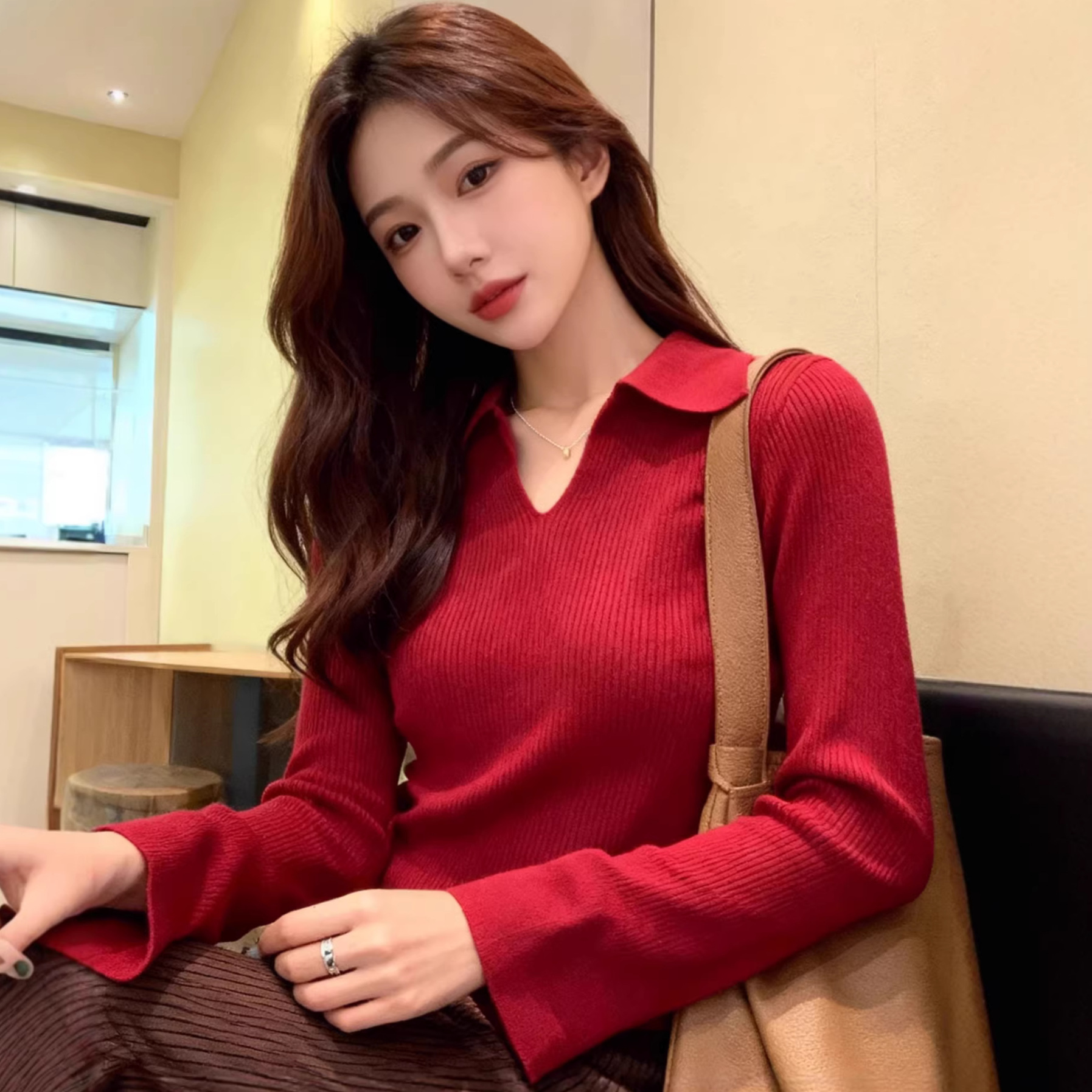 针织衫红色时尚休闲洋气别致高级感大气高档独特春季修身百搭上衣
