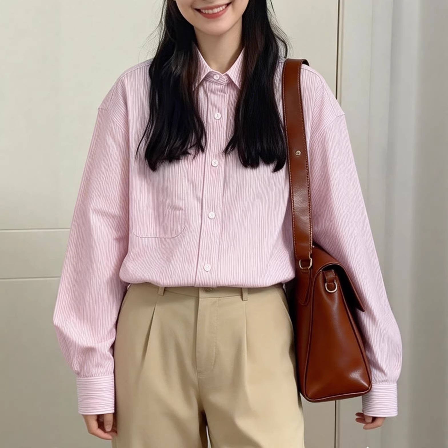 气质甜美系内搭打底上衣韩版粉色条纹衬衫女长袖宽松翻领极简风气
