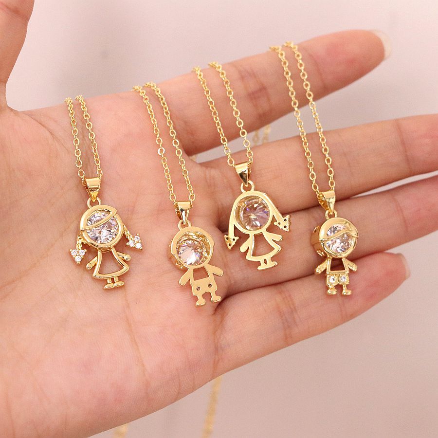 跨境时尚轻奢18K金可爱卡通男孩女孩镶锆吊坠水波链项链饰品情侣