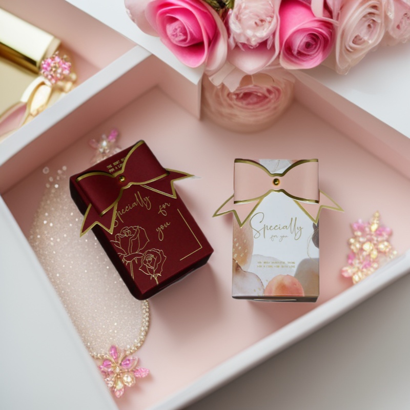 森系のワインレッド、ダークグリーン、ピンクの正方形の金箔押し加工のリボン付き結婚式のキャンディボックス、タバコも入る、軽やかな高級感のあるギフトボックス