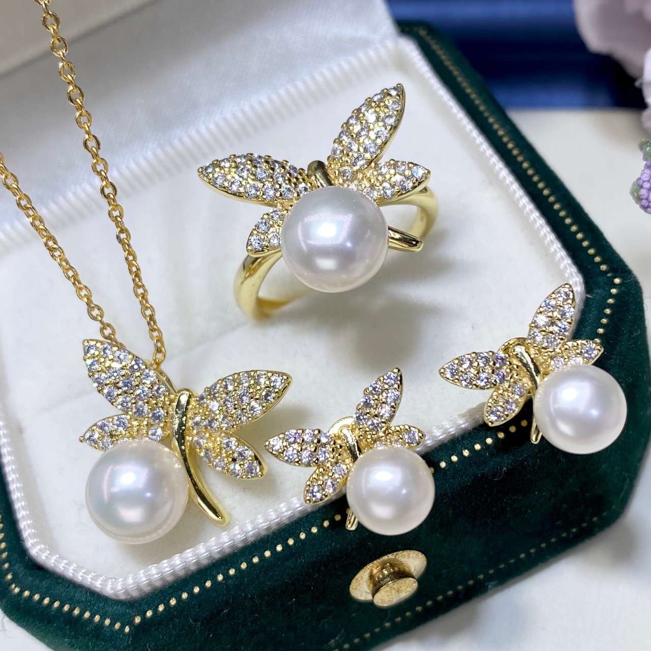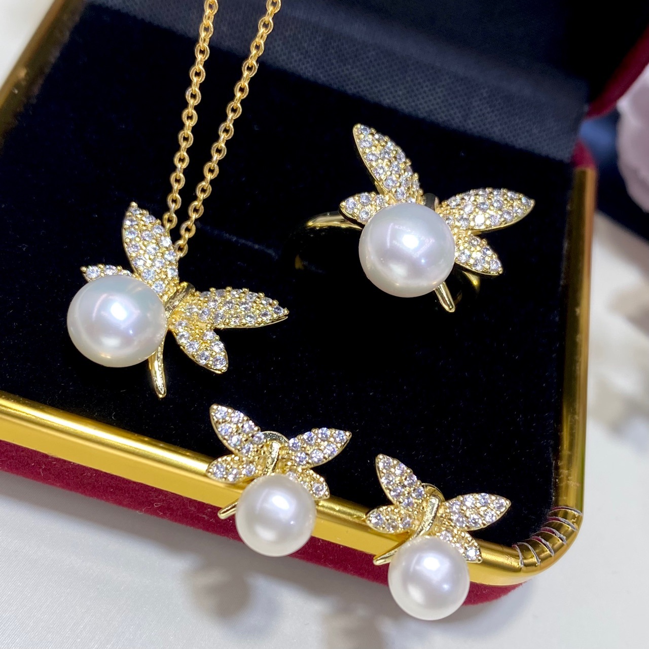 2024年新型淡水真珠セットペンダント女性ファッション真珠指輪ピアス8mm真珠セット卸売り