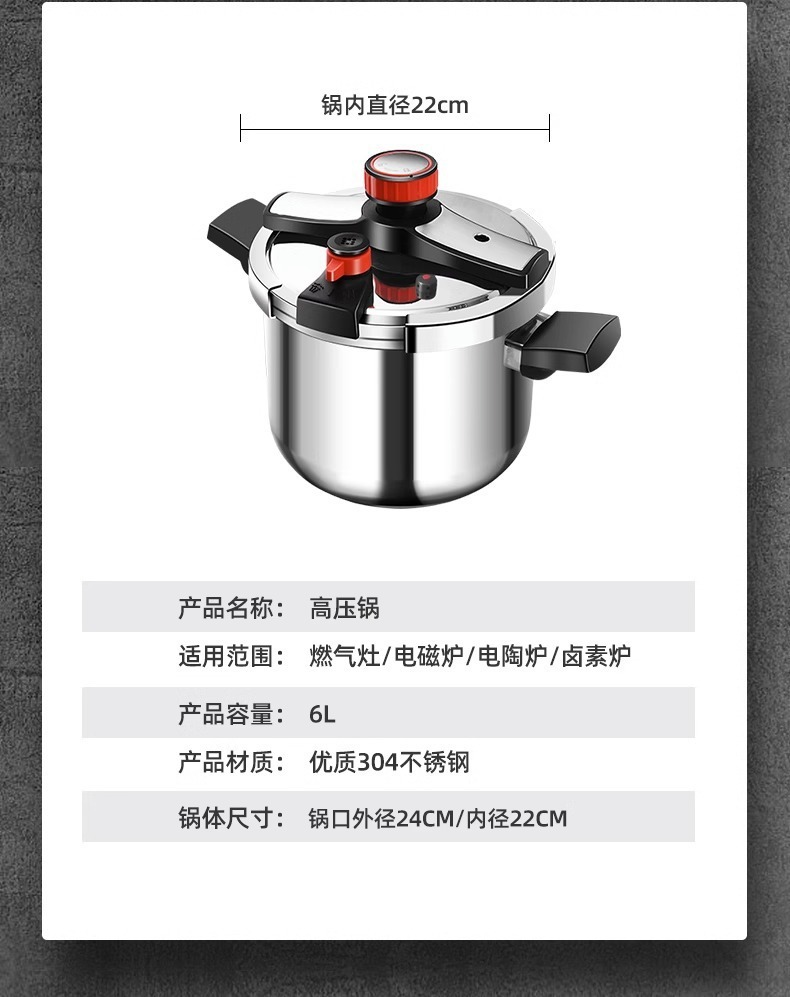 食品グレードのステンレス製圧力鍋 6L 家庭用 電磁調理器・ガスコンロ対応 耐爆圧力鍋 汎用調理器具