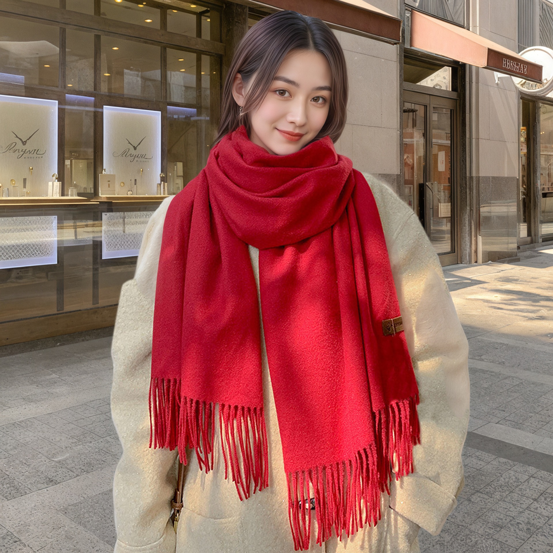 安克拉红围巾秋冬加厚韩系百搭仿羊绒围巾纯色保暖年会流苏披肩
