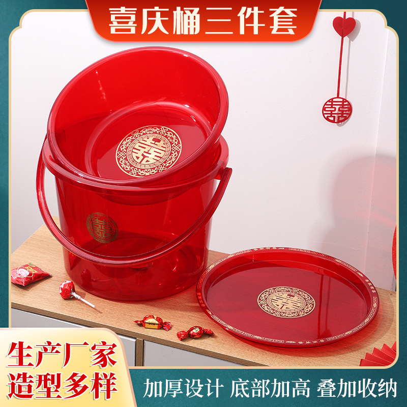 货源供应喜庆桶三件套 婚庆透明带盖加厚塑料桶 脸盆洗漱三件套