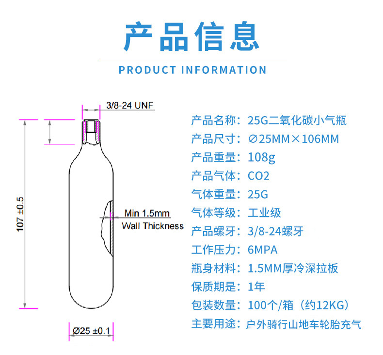 25gco2小型ガスボンベ屋外乗用携帯用ガスボンベはマウンテンバイク用二酸化炭素ボンベです。