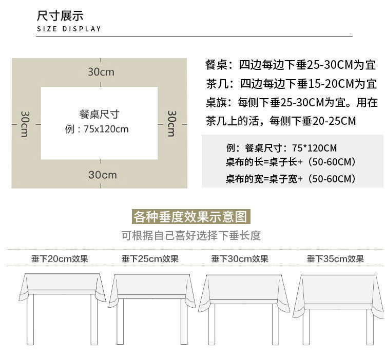 サイズ 60*60cm,60*90cm,90*90cm角テーブルと丸テーブル用ユニバーサル,60 * 150cm寮ベッド下テーブル適用,90 * 150cm机はよく使う,80*120机はよく使う,140 * 140cm角テーブル丸テーブル常用,100*160cm茶卓はよく使われる,140 * 180cmテーブル常用,140*200cmテーブルによく使われています。,40*60cmのカバータオル