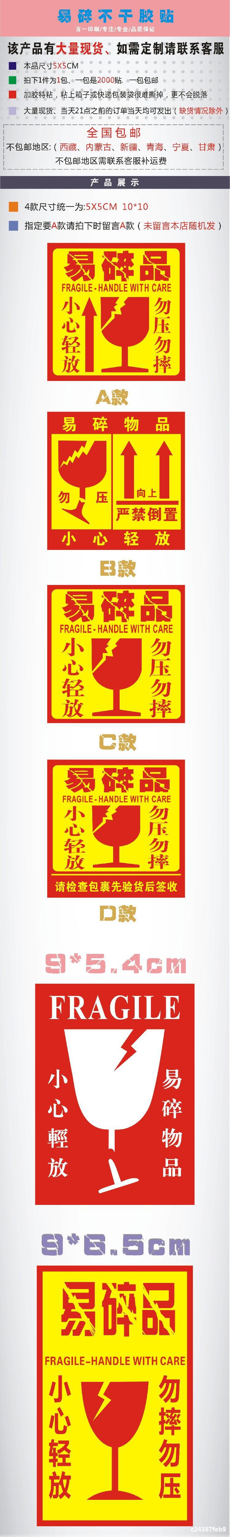 カラー 5*5cm aタイプ1000個,5*5cm bタイプ1000個,5*5cm cタイプ1000個,5*5cm dモデル1000個,10*10cm aタイプ500個,10*10cm bタイプ500個,10*10cm cタイプ500個,10*10cm dモデル500個,9 * 5.4cm黄底割れやすい500個,9*6.5cm赤地割れやすい500個,5*9cm赤底中国語500個,5*9cm赤底英語500個