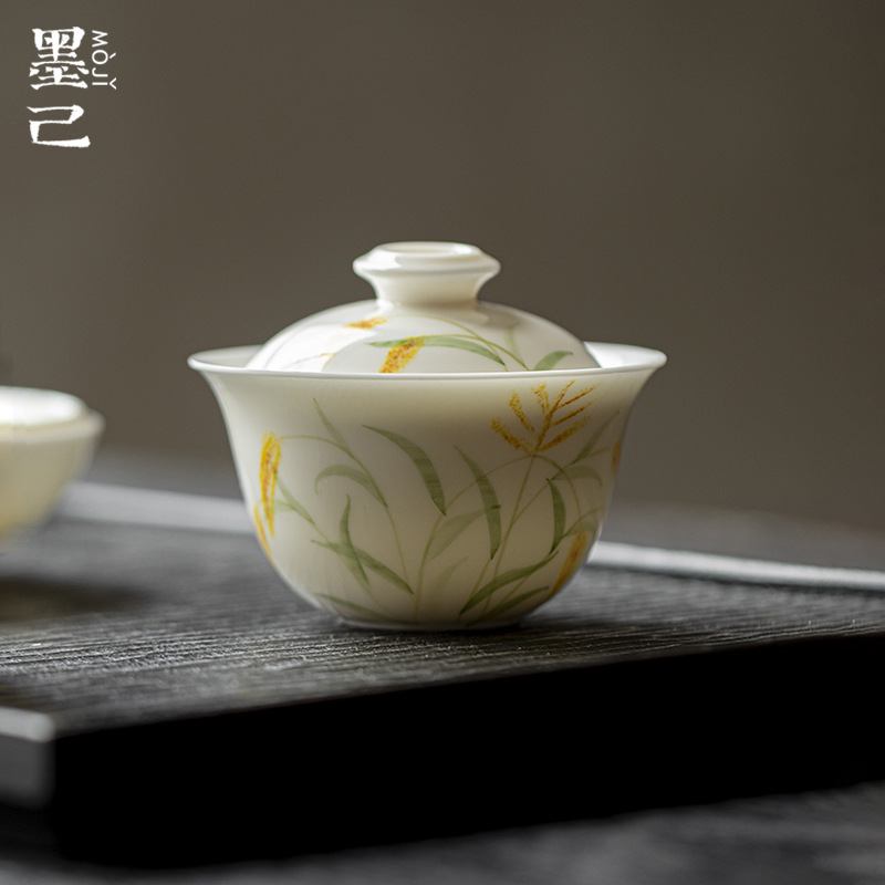 墨己玉泥白磁の手描きの麦の穂の蓋の工夫の茶器の玉の磁器の泡のお茶の小さいサイズの蓋の碗の家庭用の小さい茶碗