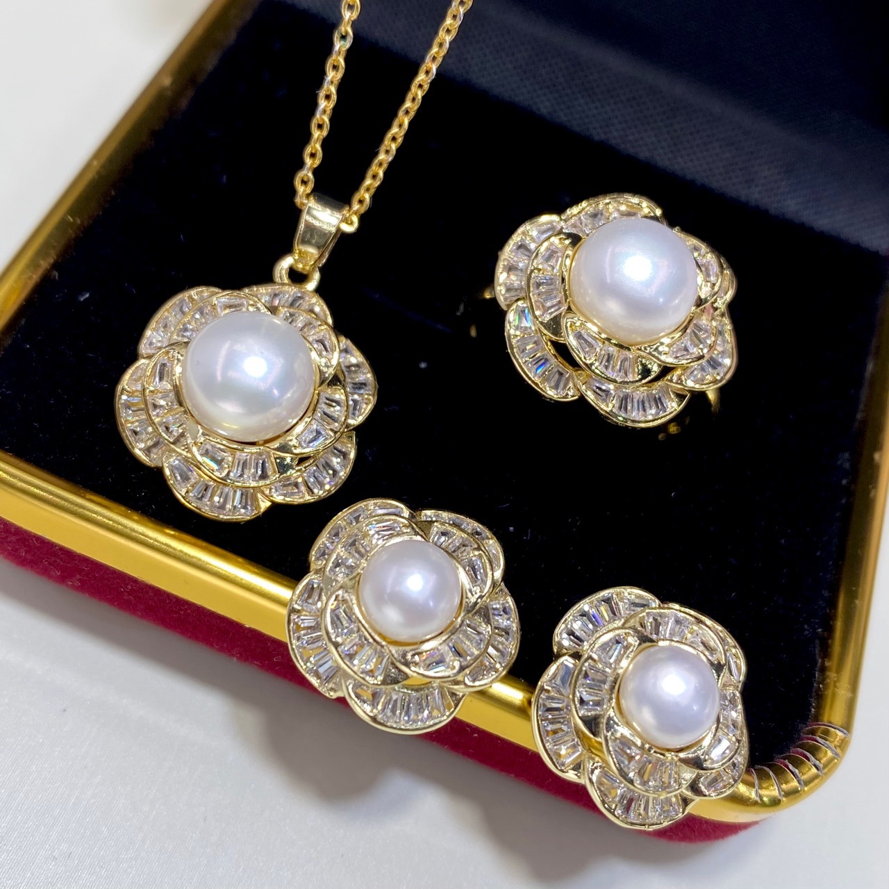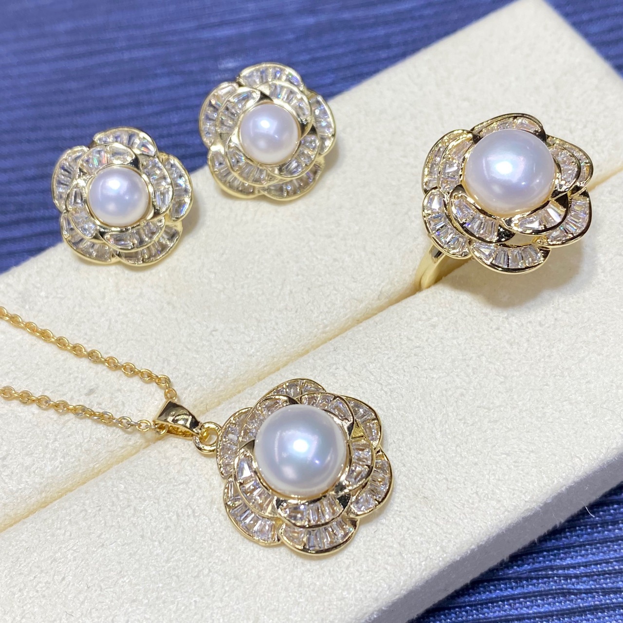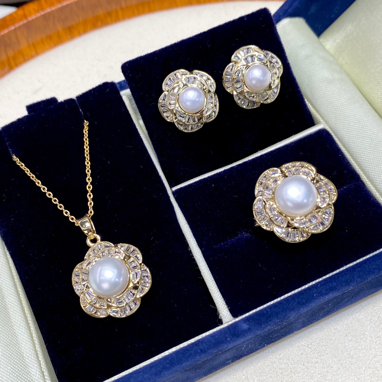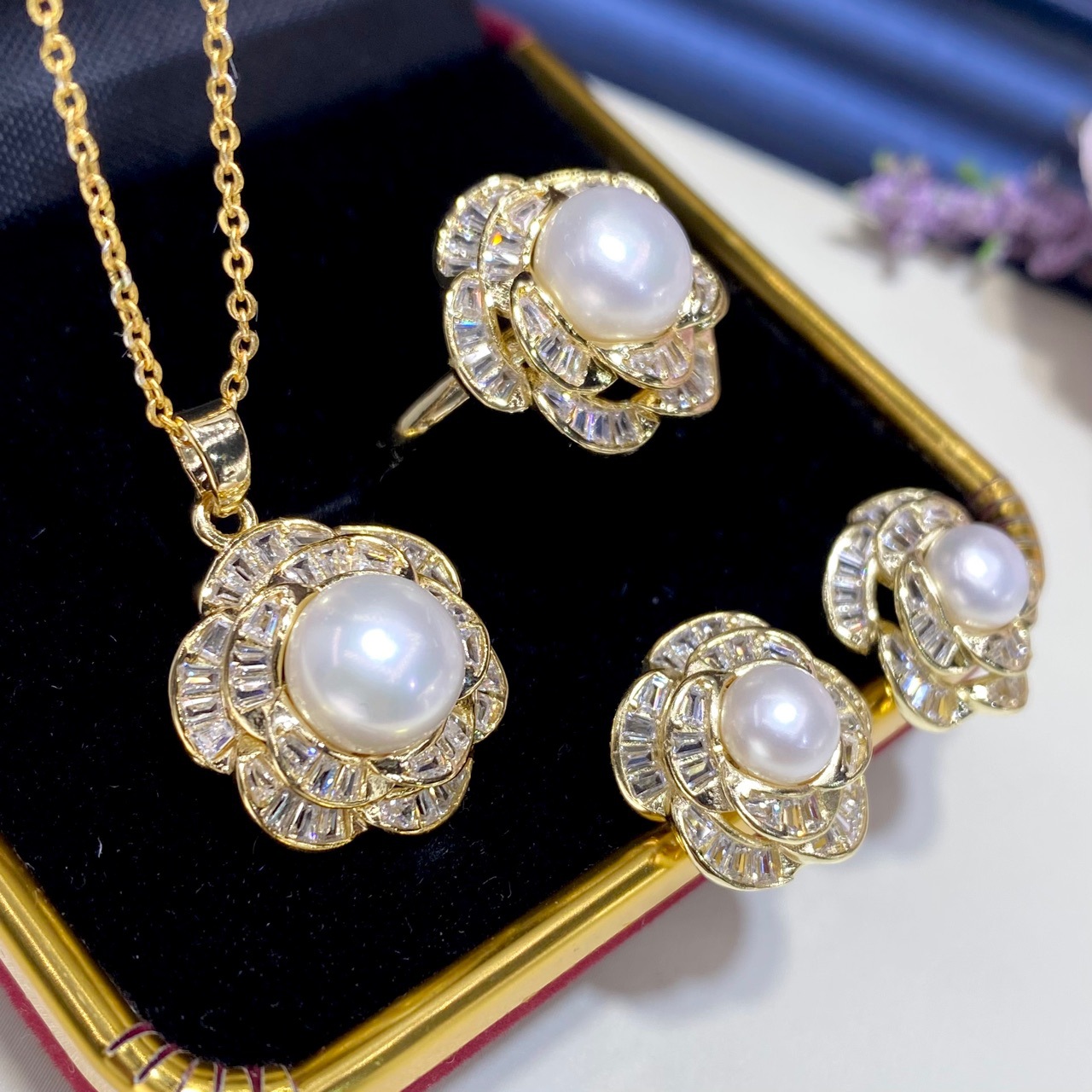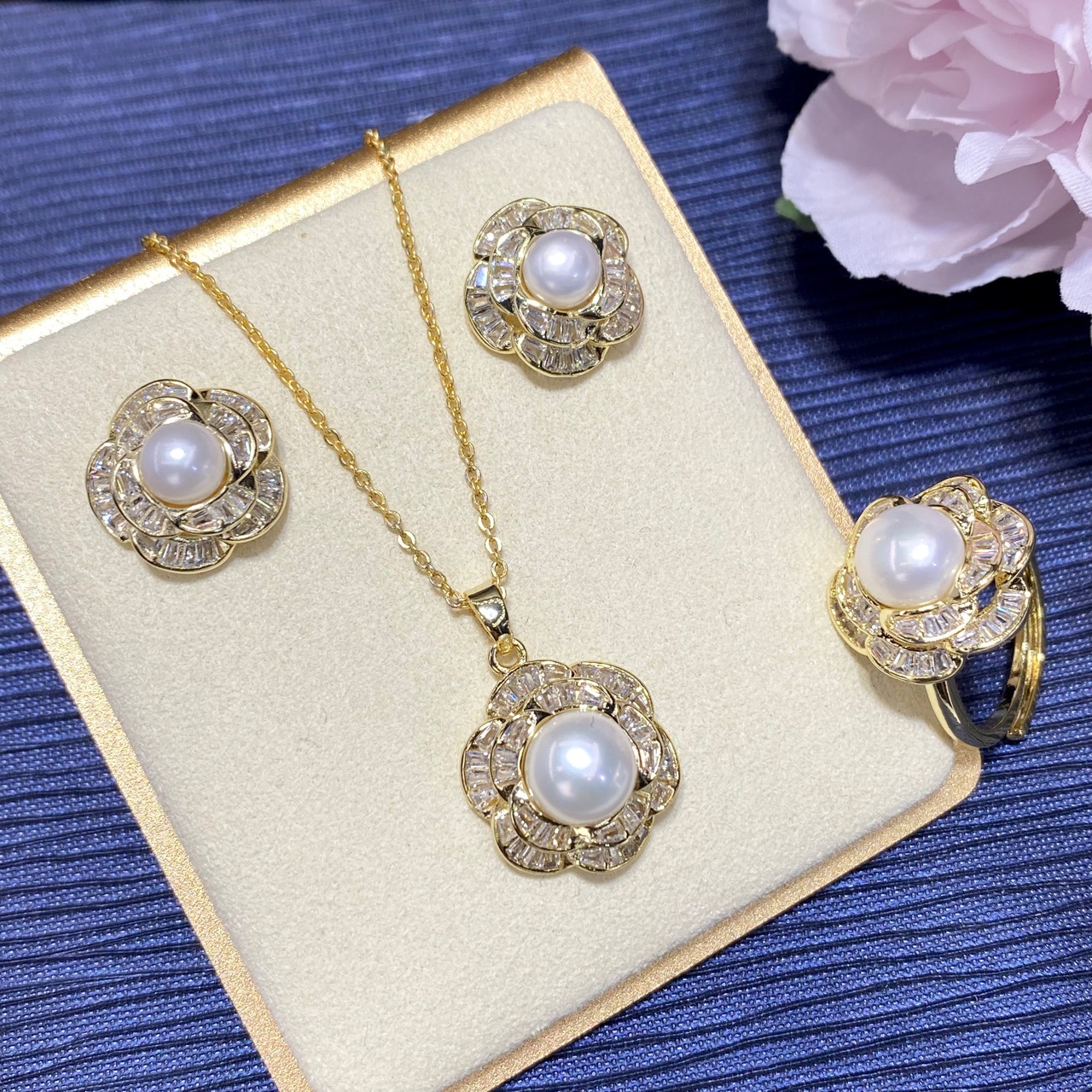 淡水真珠セット女性百合ネックレス純銀耳針ピアス指輪ペンダント三点セットクロスボーダー生放送供給