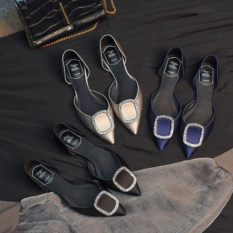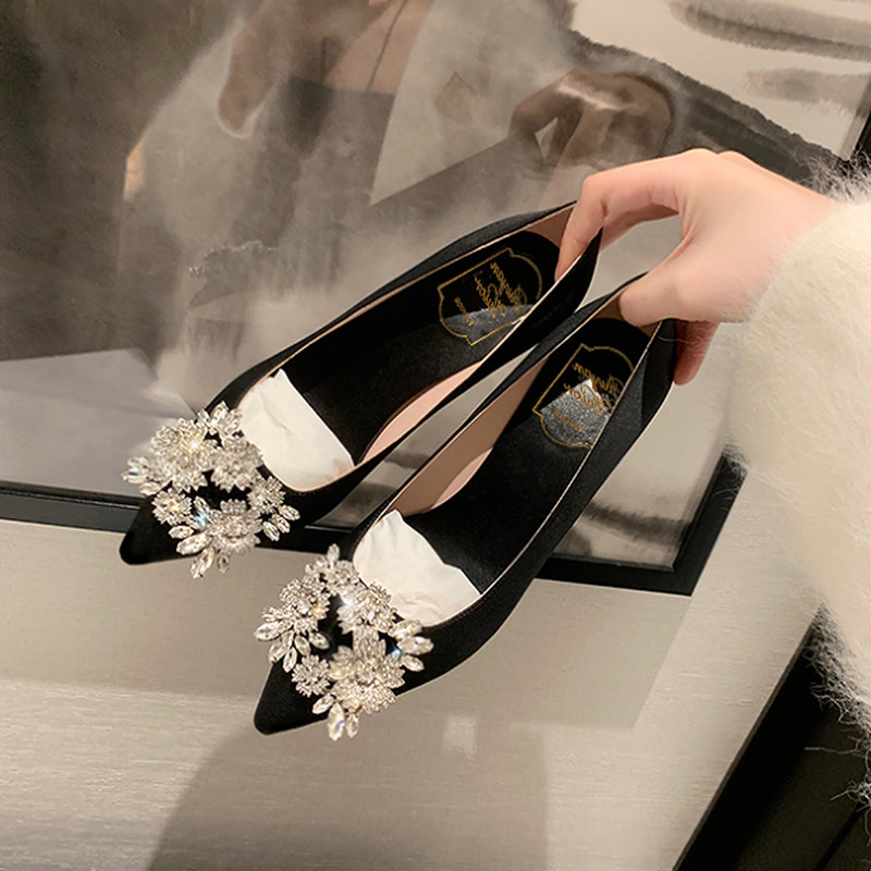 【在庫あり】ドロップシッピング ラインストーン スクエアバックル フラットシューズ レディース ポインテッドトゥ 浅口 ソフトソール シングルシューズ ブライダル ウェディングシューズ
