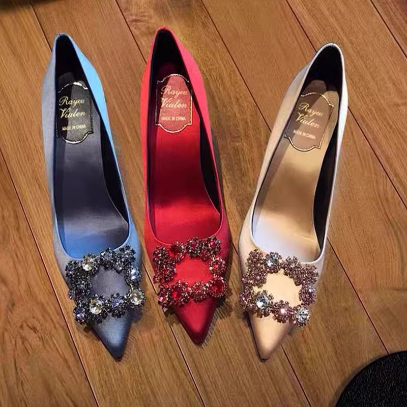[在庫あり] ドロップシッピングラインストーンスクエアバックルシングルシューズ女性のポインテッドトゥハイヒールサテンブライダルウェディングシューズ