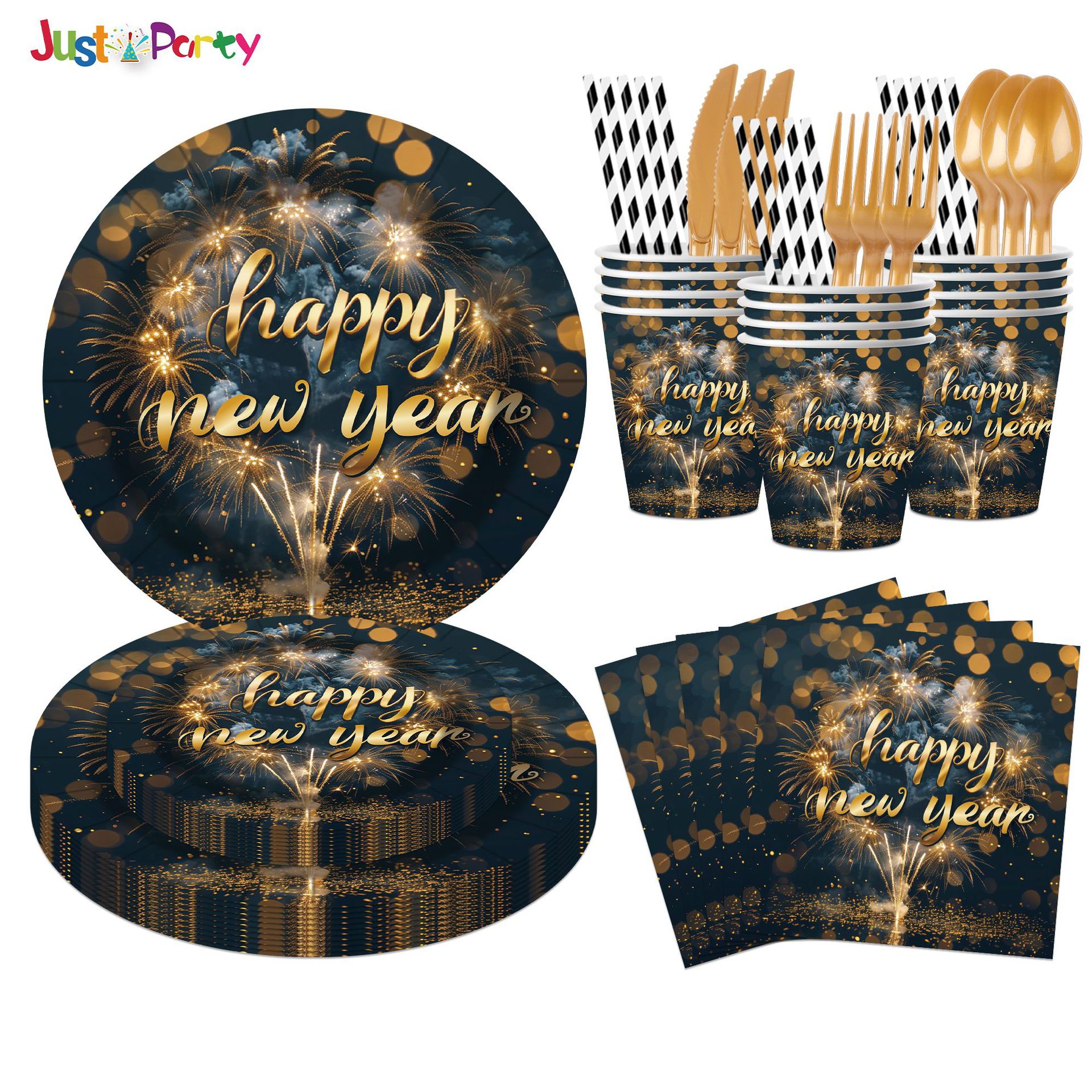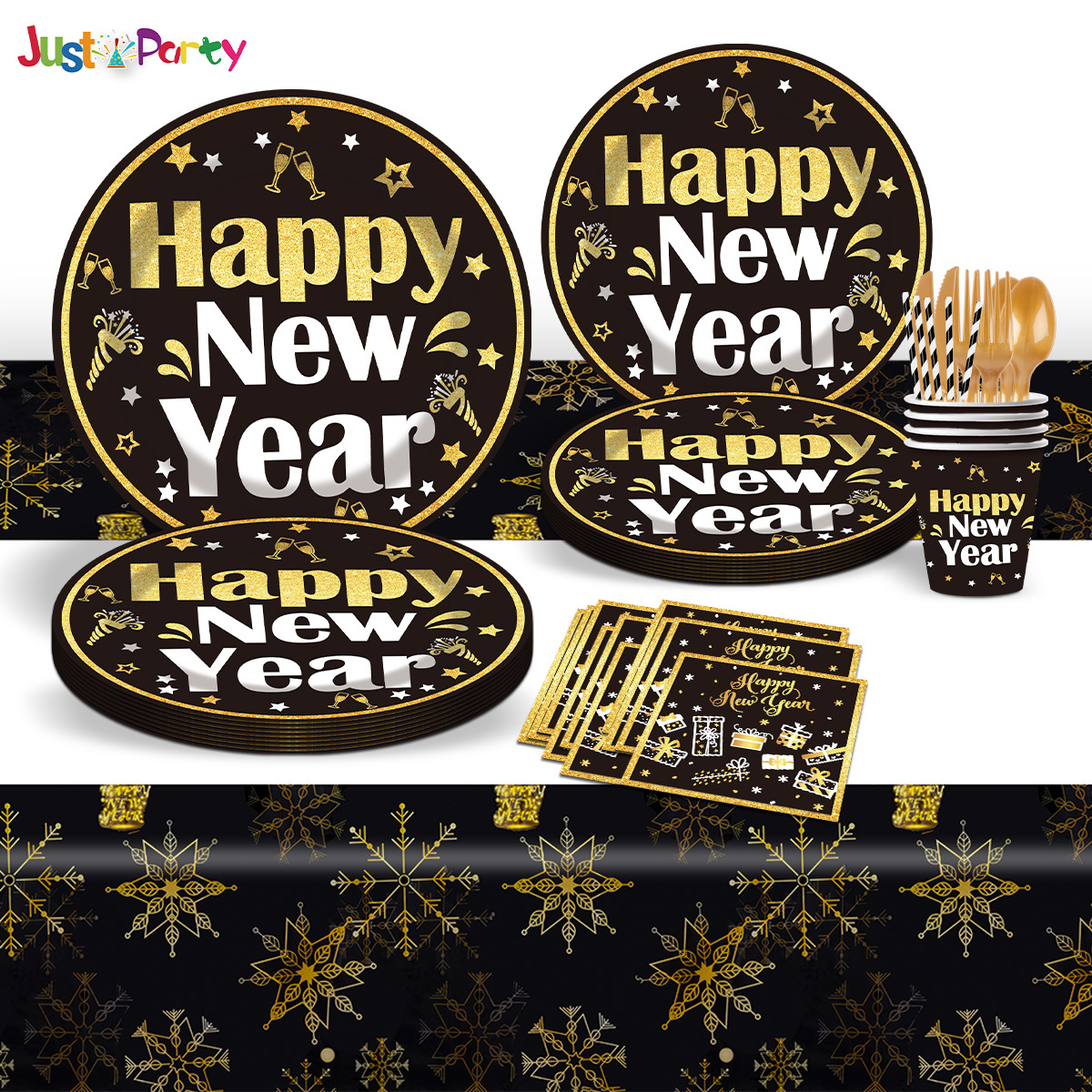 跨境新年快乐黑色元素主题一次性纸盘派对餐具纸杯纸巾装饰用品