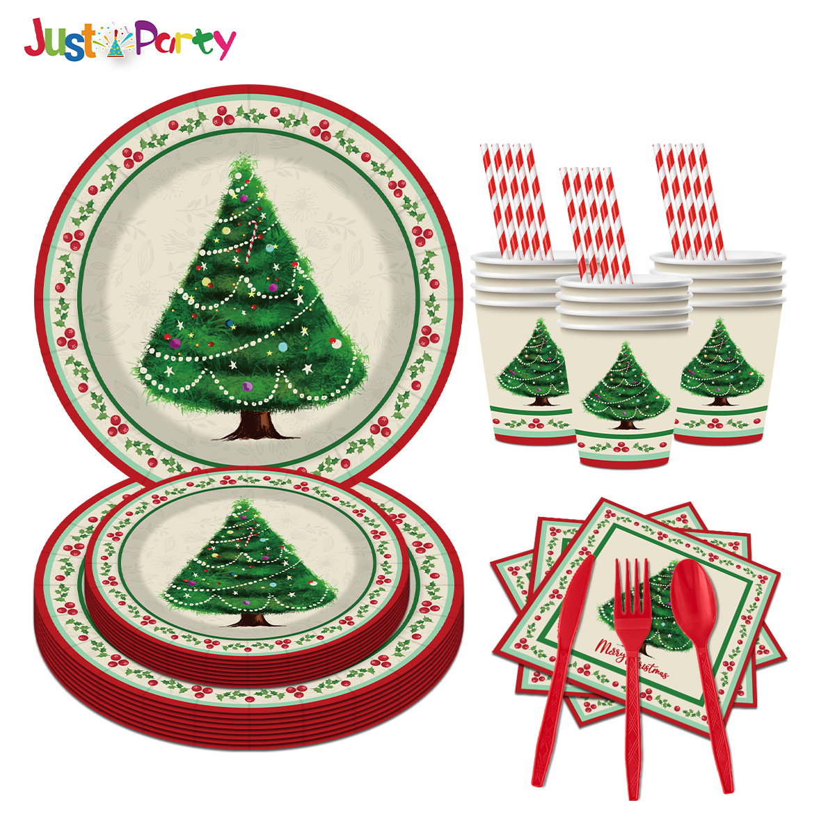 クリスマステーマパーティー装飾アレンジ用品使い捨て紙皿ティッシュ紙コップナイフフォークスプーンストロー食器