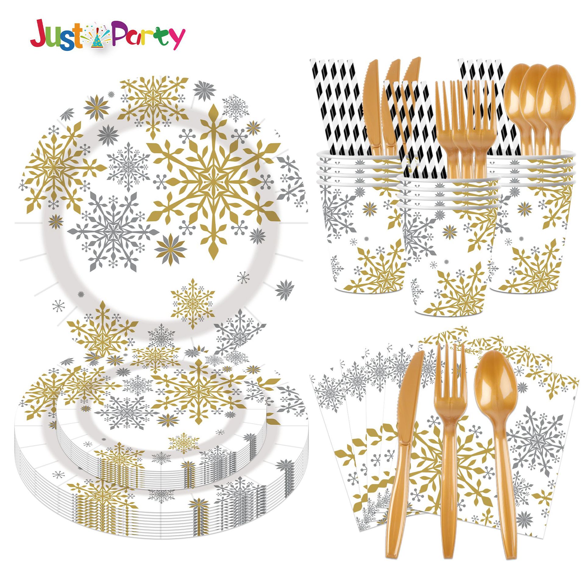 金银雪花圣诞节主题一次性纸盘刀叉勺纸巾纸杯派对套装饰布置用品