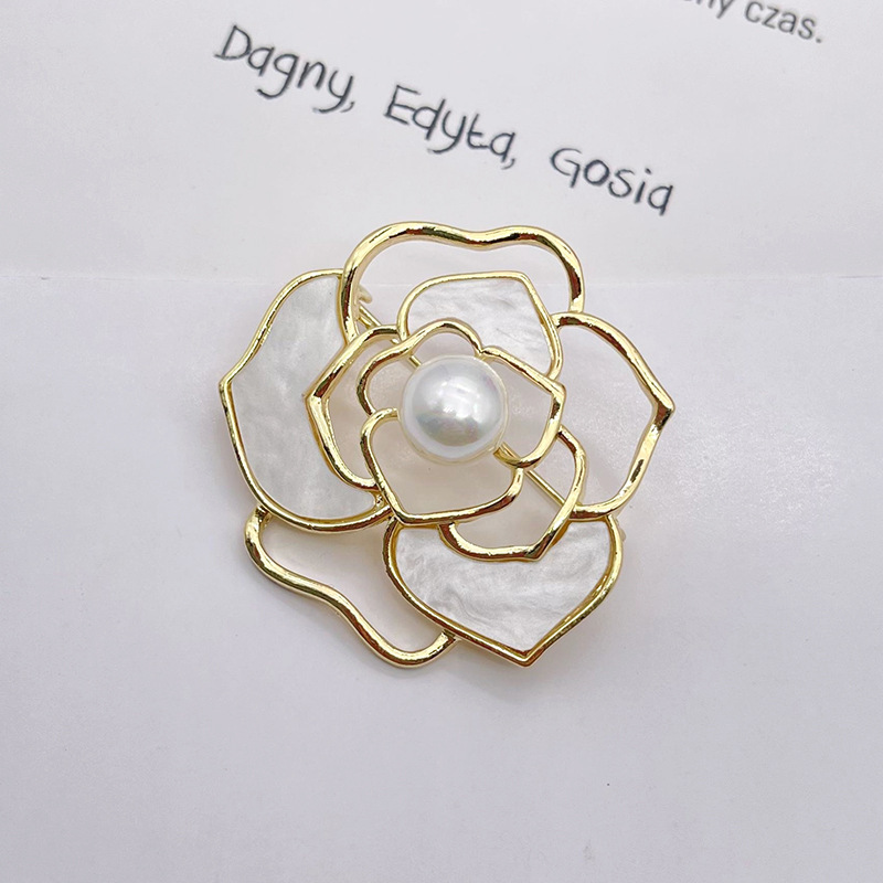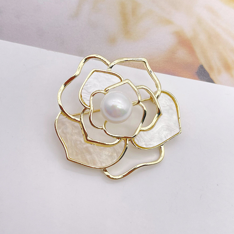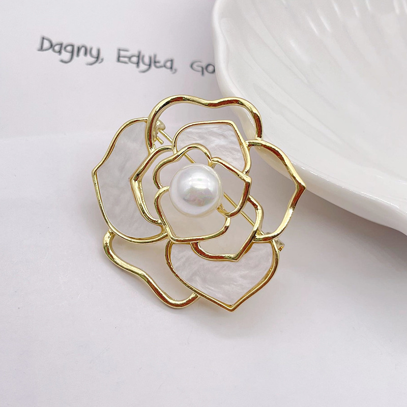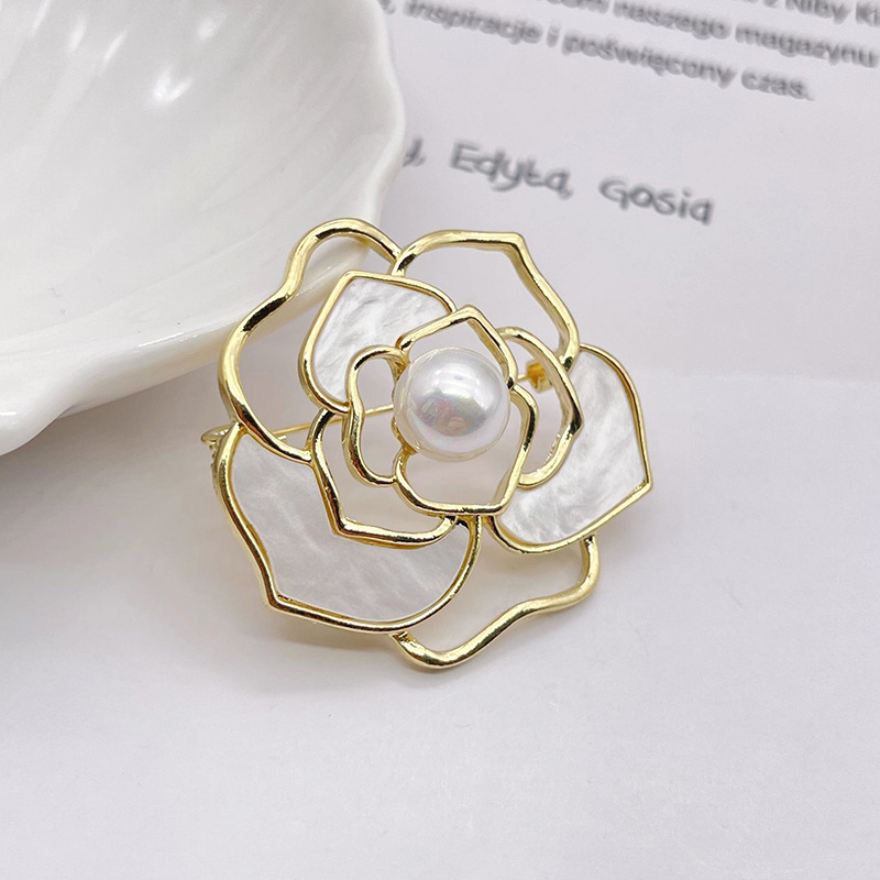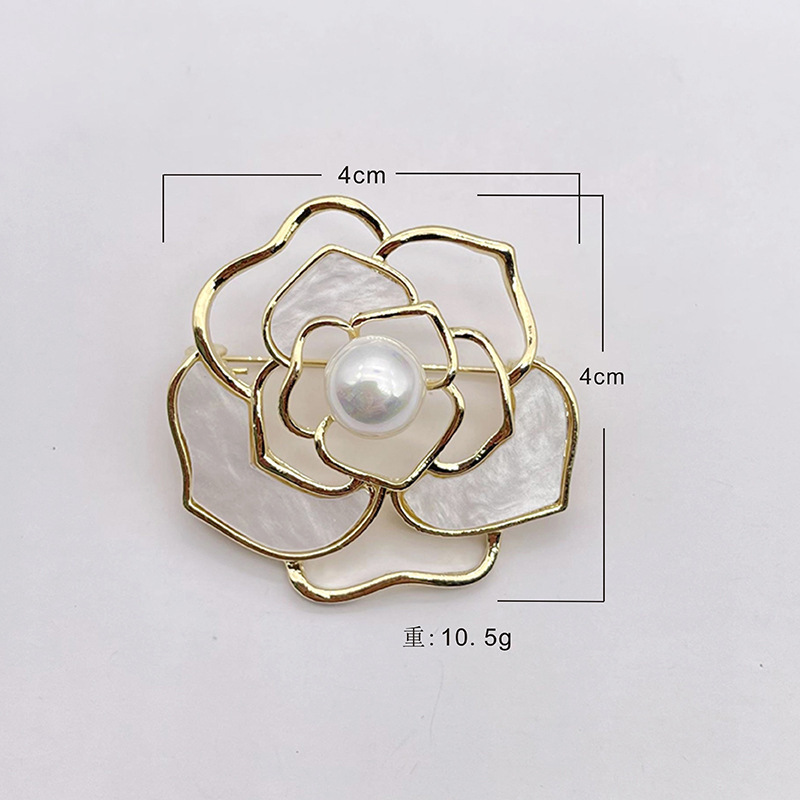 貝殻風透かし椿の花胸飾り、バラの花ピンバッジ、女性用模造真珠ピンバッジ、コート胸飾り、チャイナドレス、白水晶