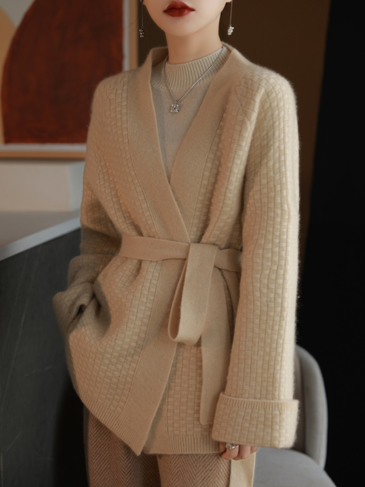 秋冬新款羊毛开衫女提花系带螺纹毛衣宽松时尚百搭针织外套