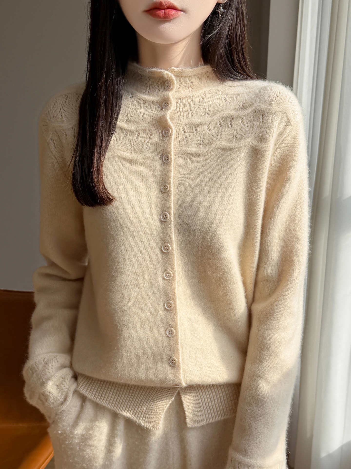 法式波浪镂空钩花半高领毛衣女秋冬新款针织开衫外套加厚上衣外搭