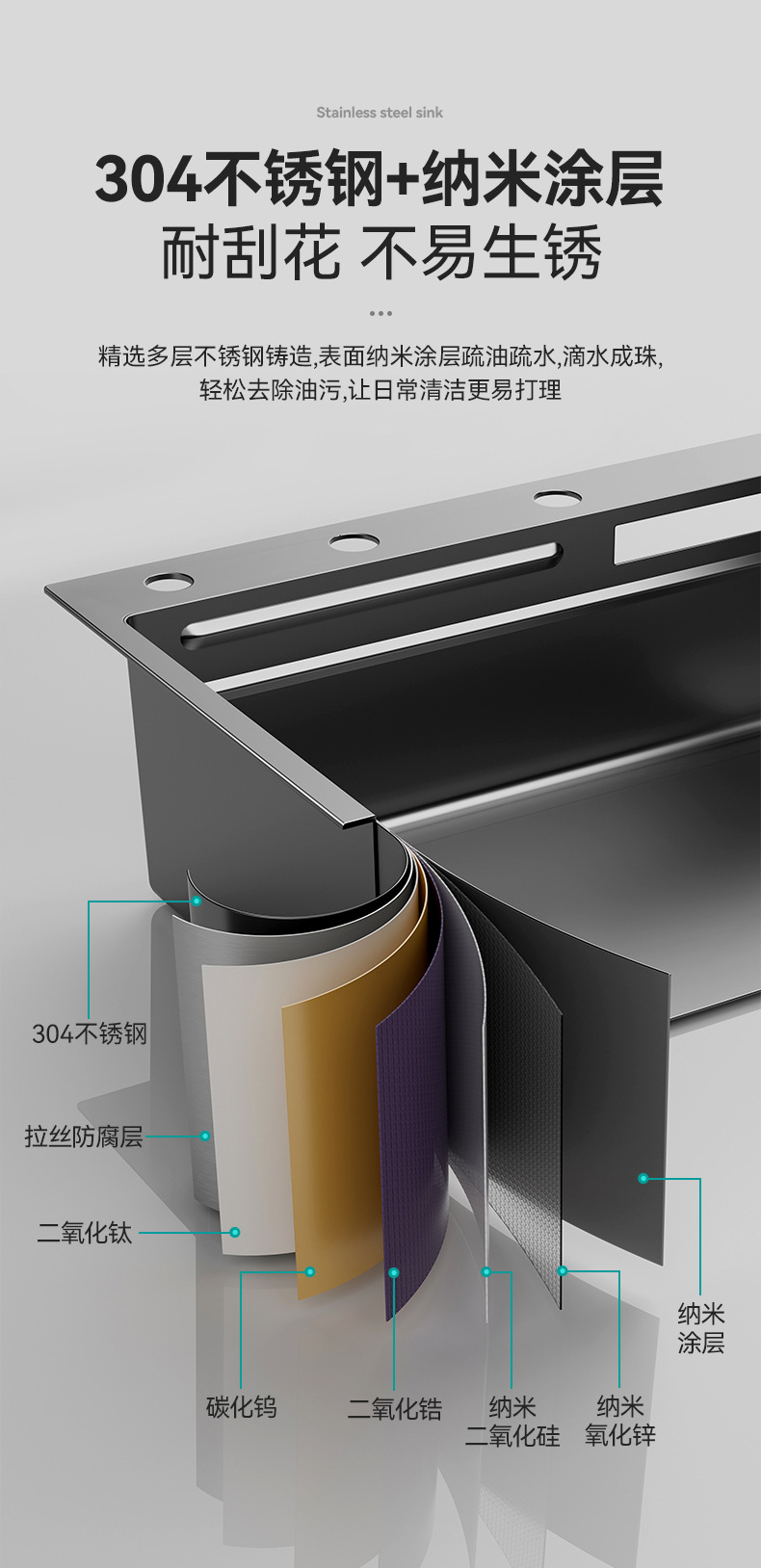 ナノガンメタルグレー304ステンレス製シンク 大型単槽キッチンシンク 食器洗いシンク ナノ抗菌